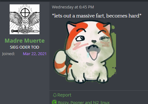 3. Coincidentally, a thread on the "boykisser" image is made in the Prospering Grounds section which examined its usage in child grooming circles on Reddit and Discord. It is composed mostly of misinformation, most notably attributing the creator of the image as the leader of these grooming circles (which was demonstrably false). This in of itself is not an admission of intentional misinformation or misdirection. However, threads which focus on communities and threads which examine aspects of the furry community are prone to false flags and misdirection by sockpuppets of those who are within these communities. While the thread is rightfully criticized, it also suddenly gets new users or users with relatively unused accounts posting literal nonsense. This suggests members of these grooming circles were aware of the thread.