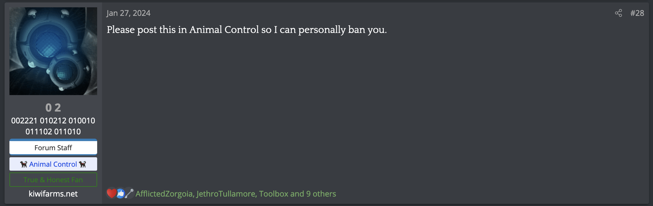 He's making the case that 02 unfairly targeted him, despite the fact that admin and the other admins on the site treated me and catler equally, but the difference is I respect the house mods gave me permission to post in, while Catler shits it up, break rules then plays the victim.