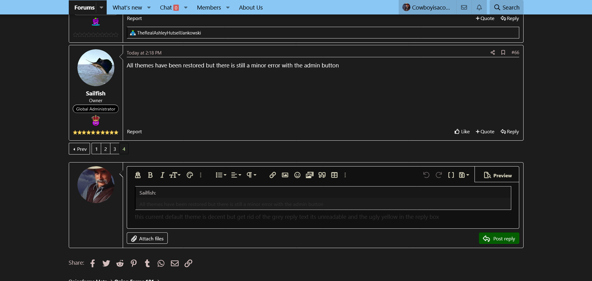 this current default theme is decent but get rid of the grey reply text its unreadable and the ugly yellow in the reply boxAll themes have been restored but there is still a minor error with the admin button