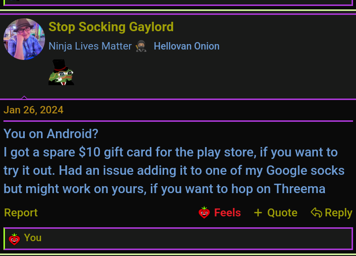 I did have an actual spare gift card and typically only use Threema for comms. I don't know what part I'm supposed to be ashamed of.