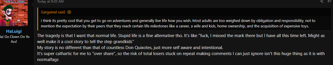 Aaaannnnnd, comparing xerself to Don Quixotes. A guy who is bonkers, and tilts at windmills? Who does he see as his Panza? Is there some poor schmoe of a probation officer who has to decode Dani's babbling. Anyway, if you were to compare Dani to a fictional character, it would be...