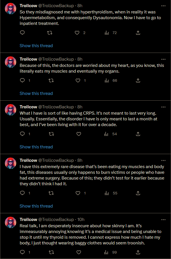 She was claiming hyperthyroidism a week ago and less than 24 hours after her rattling on stream she says she's been diagnosed with something else and needs inpatient.