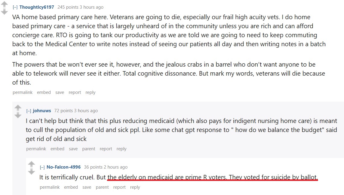 Here's more fed-hatred towards the general public, in this post it's towards the elderly: "The elderly on medicaid are prime Republican voters. They voted for suicide by ballot."