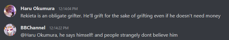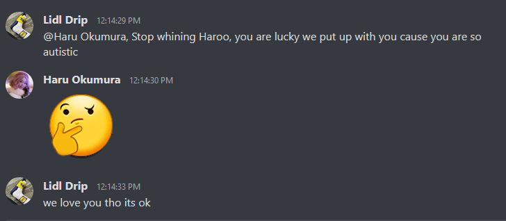 <2022-11-13T02:46:27.000Z> Haru@poa.st: Oh and he also admitted to sitting in "the anti-Haru Discord" (again despite never interacting with me even once)