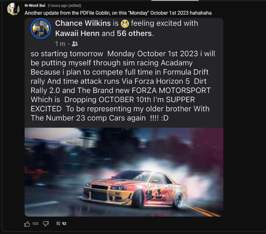 He really wants to beat that one guy in racing despite never having driven a vehicle, he would kill someone if he even tried so i hope he never gets a license.the goblin is going to try and go through a racing academy lmao