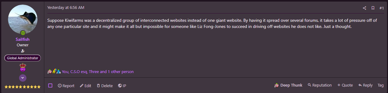 2nd Step: Rather than Kiwifarms being one monolithic forum, redefine Kiwifarms as a genre (a decentralized group of diverse interconnected forums, blogs and so forth). Basically an interconnected “Kiwiverse”. (No, I would not be the leader of this Kiwiverse.)
