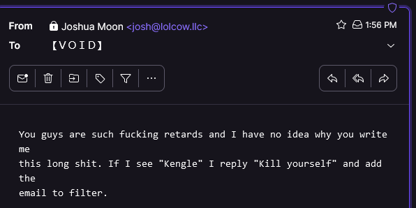 I wasn't expecting Josh to respond any other way; and I'm only sharing this with the site so everyone can see exactly where Josh's priorities are. He doesn't care about his content, he doesn't care about his site, he doesn't care about his userbase, and he really, ultimately doesn't care about the continued existence of the content on his site. He cares about his monopoly on lolcow culture. That is all he cares about.