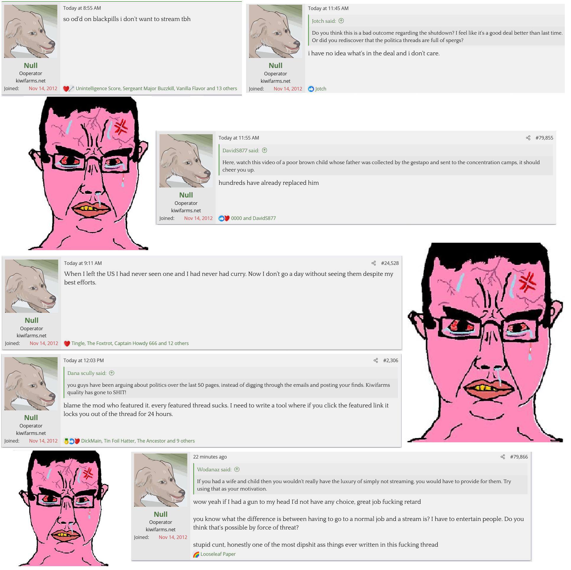 The Sharties were right, Null should go on estrogen, get a♠️ tattoo and accept the BBC as his personal lord and savior. It sure beats crashing out on "mY fUcKiNg SiTe" to get the attention of Americas Favorite Pedophile.