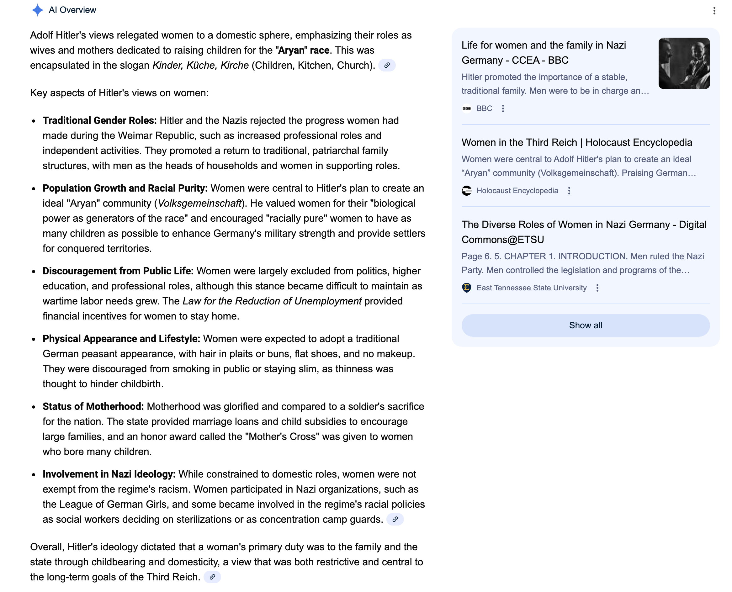 First of all, this goes both ways. If you think Hitler was bad while in power, then you can actually blame women for enabling him to get into power. Not everyone is a internet larp Nazi raised on 4chan/pol going through his edgy Nazi phase. So outside of your little bubble, this could be seen to make women, as a collective, look bad. Second, Hitler was pro-German above all else. A nationalist. His NatSoc government was pro-natal to make more German people and to improve the German people via eugenics. Do you know why he needed more people? And to enact policies to encourage German people to get married and have kids? Because he knew he was sending millions of German people to the front line to get murdered in a bloodbath, in all directions around Germany. Any country waging war needs a fresh supply of military-age men to fight the war. That's why at the end of the war, Germany was recruiting young boys and old men to fight because it had gotten that bad for Germany. It's not because Hitler or the German NatSoc government was feminist. Josh is merely projecting his feminist ideology backwards in time onto people that did not hold his views.