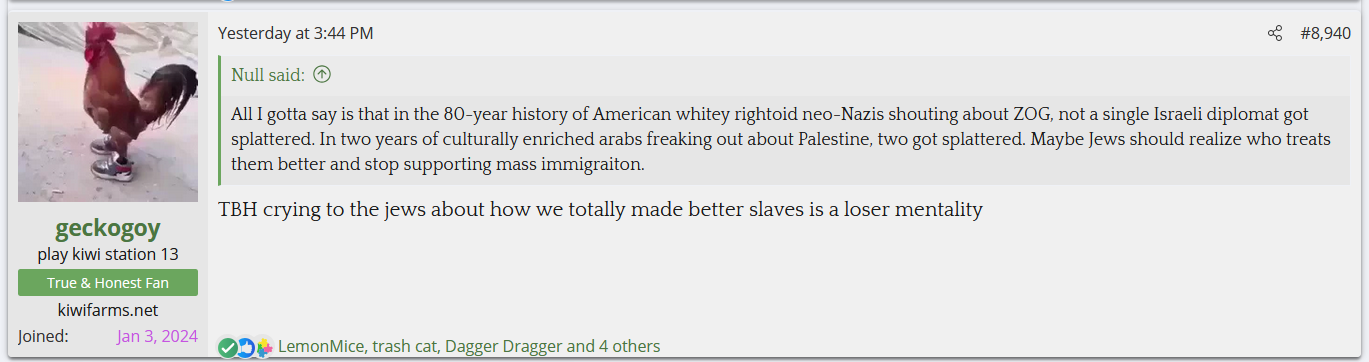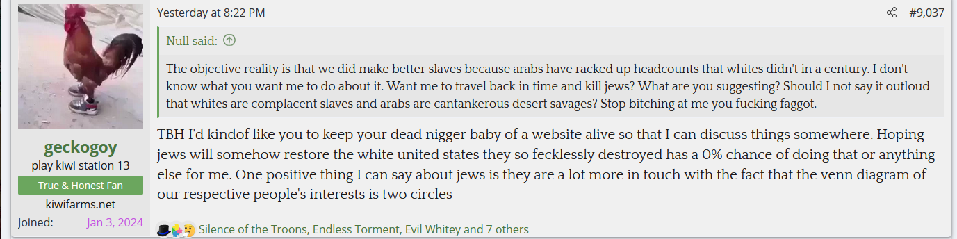 Null got into a spat with one of his simps, a white nationalist named geckogoy, over whether Whites are slaves to Jews with the argument ending with geckogoy calling Kiwi Farms a "dead nigger baby of a website".