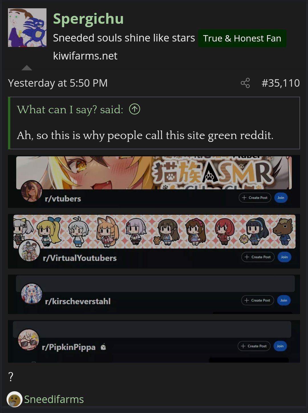 nothing surprising. you see, while the harassment isn't planned on the lolcow's thread, they're planned either in PM chains or off-site. this video pretty much reinforce and confirm what everybody knew about green treddit