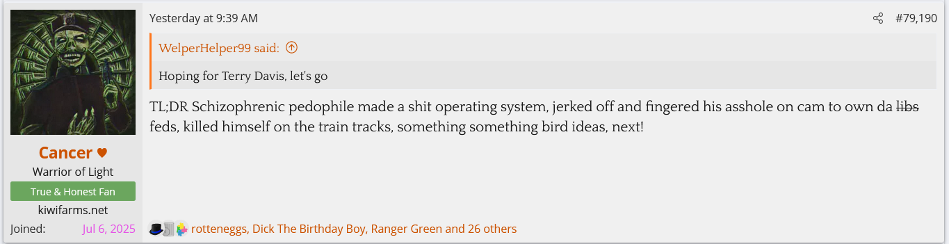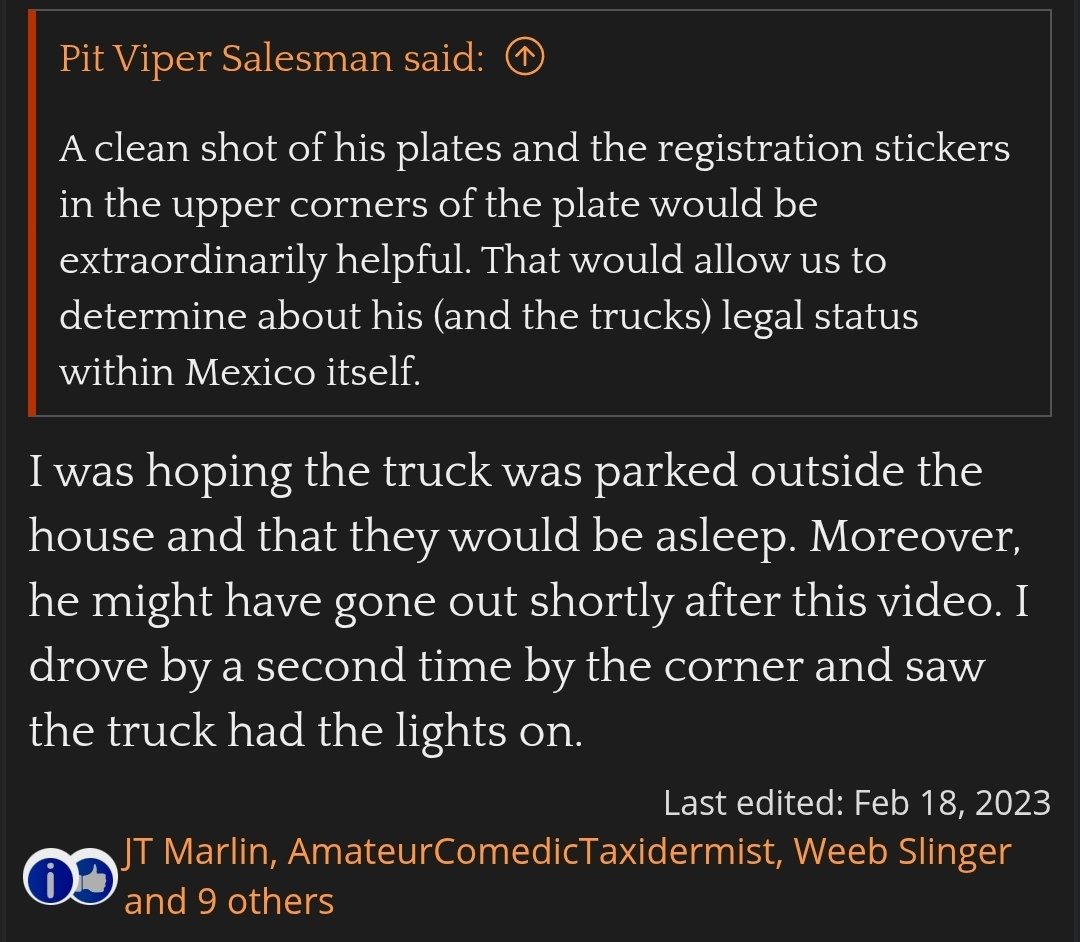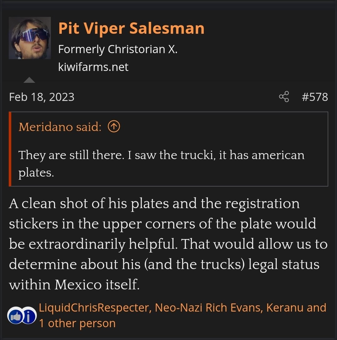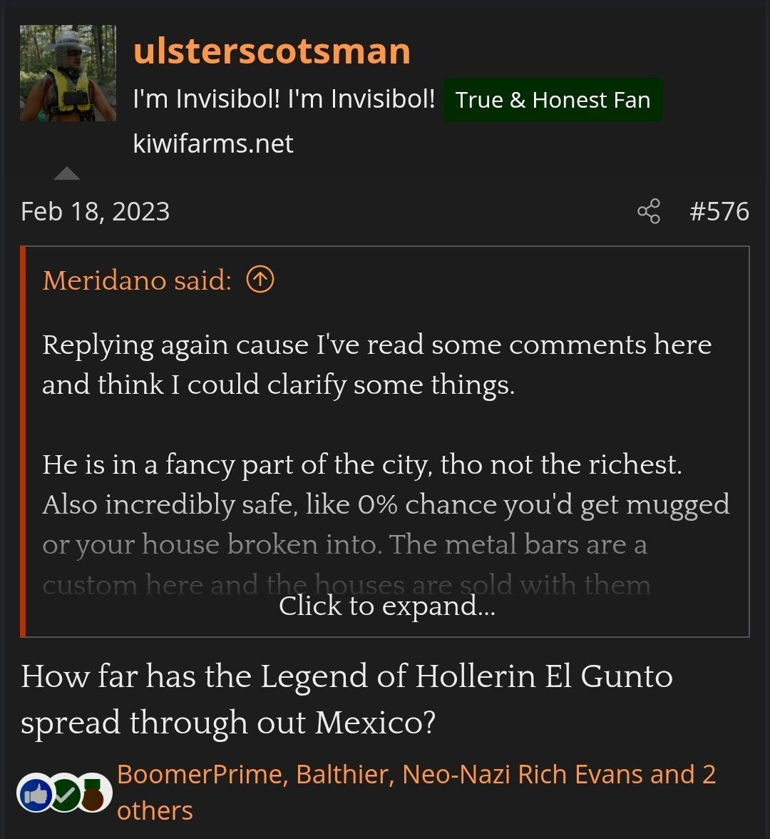 I remember a user personally going to Metokur's house to put a sack of potatoes on his doorstep and took a picture of it.He is lying by omission about Kiwi Farmers visiting people's houses. Kiwi Farmers do not take pictures of themselves outside lolcow houses for obvious reasons but everyone cheers when someone posts a self-made picture of a lolcow residence.