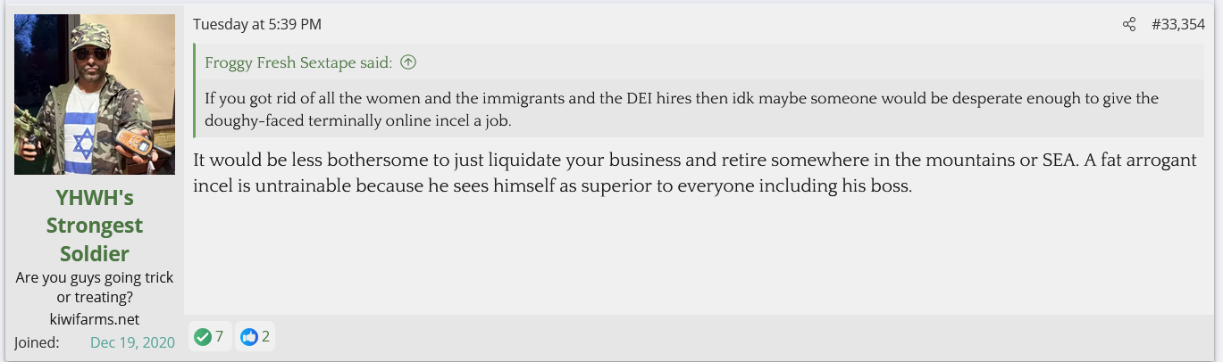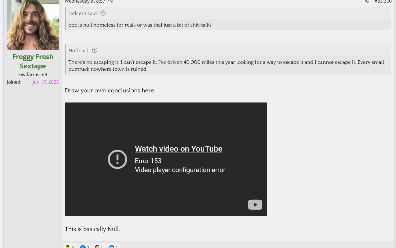 Josh would be averaging 110 miles per day, which means he either spends 1+ hours commuting every day, works as a delivery driver, or is driving around in an RV between campgrounds. I do not believe Josh has any job than Kiwi Farms because he makes so much money from grifting his paypigs, so why exactly is Josh making such an assertion?Also Josh claiming he's "diven 40,000 miles" this year means he's driven across the length of America (west coast to east coast, 2800 miles) over 14 times. Does anyone actually believe this?