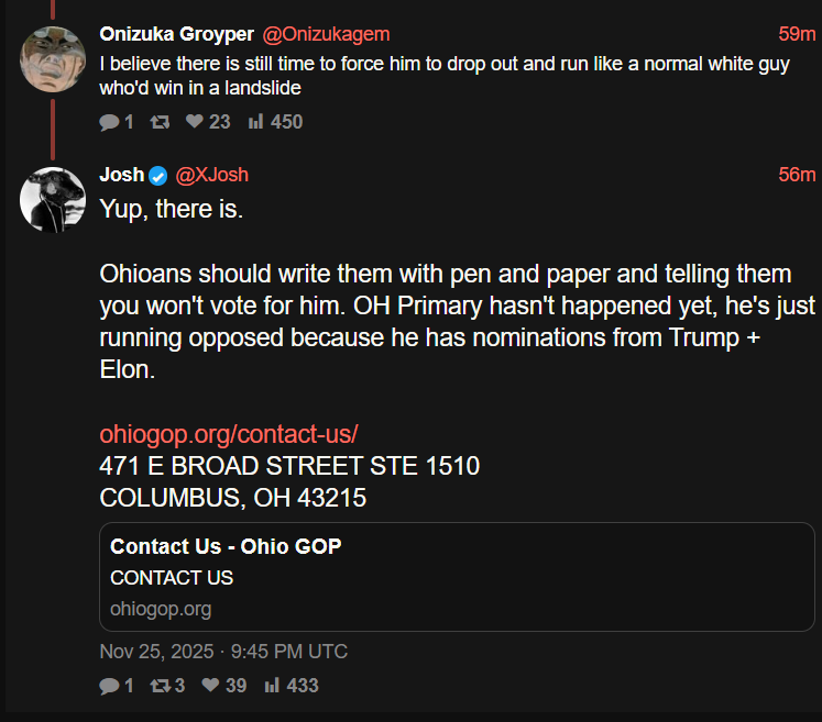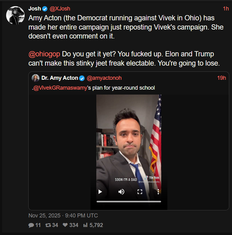 So if anything, I strongly feel that Vivek Ramaswamy is going to become the governor of Ohio unless he finds himself in a scandal that he can't recover from. Jersh has no clue how the political game in America works and it's going to be hilarious to watch him crash out over a non-white Hindu being in a high position of power.