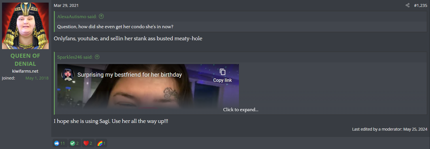 The Easy to Track Username thread doxed a Beauty Parlor member who had been on the forum since 2018 and found out she was a mentally ill OnlyFans model. They also doxed her husband and children. Null flew into a rage at yet another oldfag female member leaving the site, and threatened to delete the entire thread if they didn't back off.