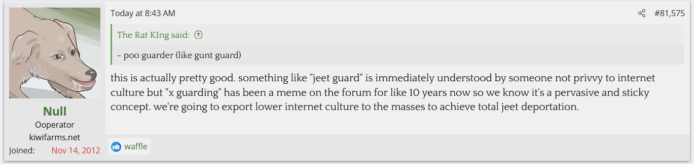 I looked into Teridax and found out he is an OG troll from the GamerGate days who's claim to fame was screwing with the anti-Zoe Quinn side and ejaculating onto a WWE figurine and apparently sending a picture of it to John Cena. Nowadays he helps the Twitter left mock and dox the Twitter right. His first posts on Kiwi Farms back in 2017 were mocking Null and his family for being doxed and harassed while calling Null a NAMBLA member. He's currently helping the BAP thread go after the BAPsphere.