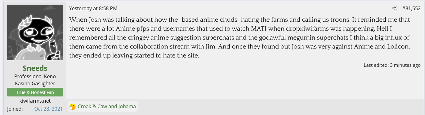 But Jersh being a fucking dumbass, he scared away those weebs over his hatred of anime and the anime community in general.