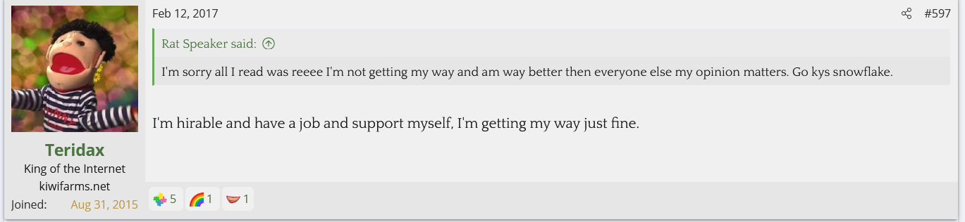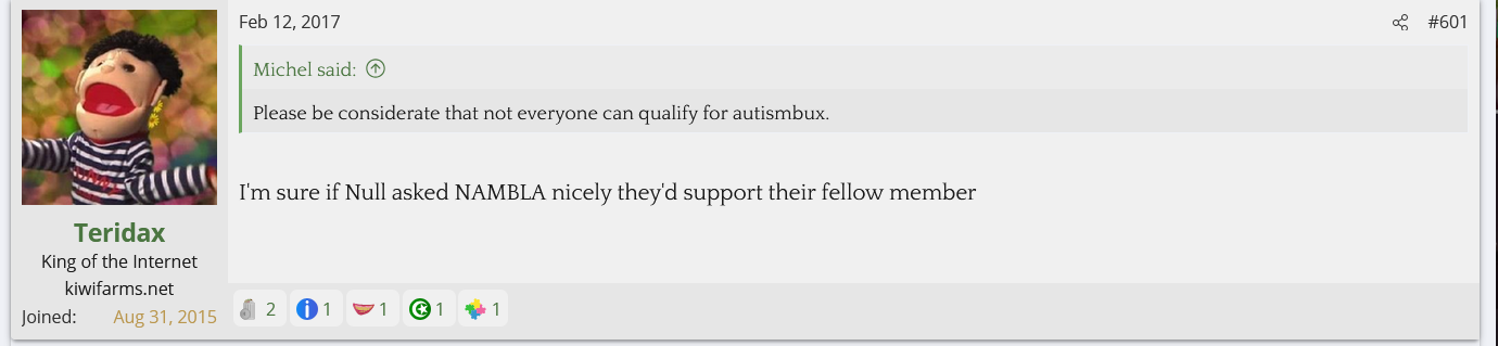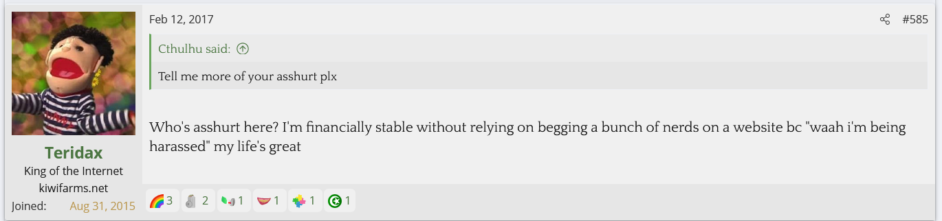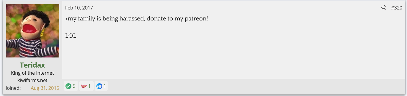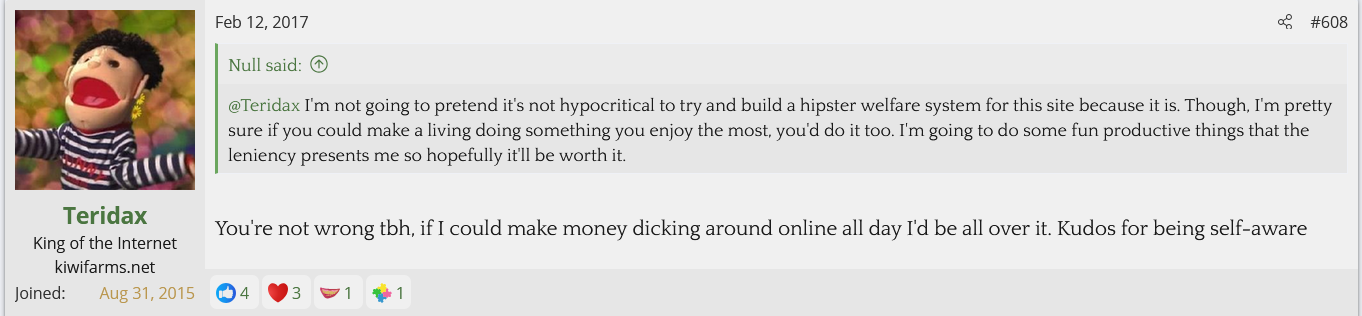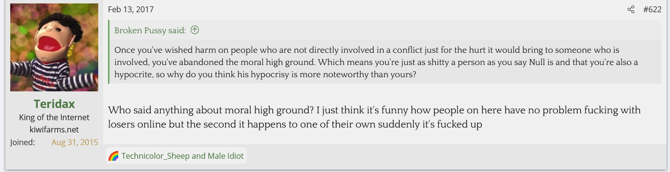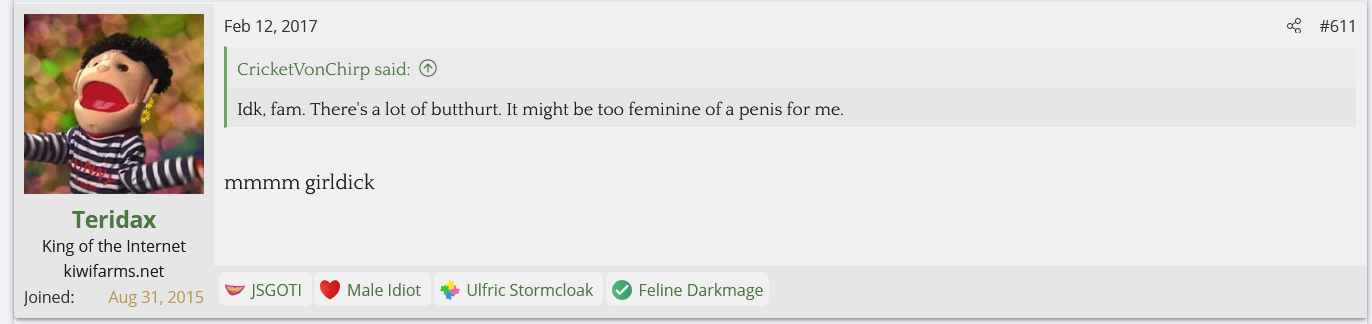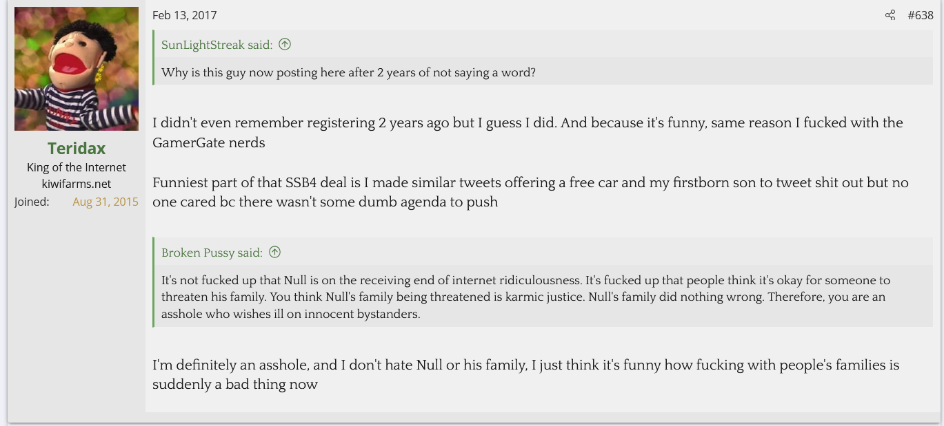 I looked into Teridax and found out he is an OG troll from the GamerGate days who's claim to fame was screwing with the anti-Zoe Quinn side and ejaculating onto a WWE figurine and apparently sending a picture of it to John Cena. Nowadays he helps the Twitter left mock and dox the Twitter right. His first posts on Kiwi Farms back in 2017 were mocking Null and his family for being doxed and harassed while calling Null a NAMBLA member. He's currently helping the BAP thread go after the BAPsphere.