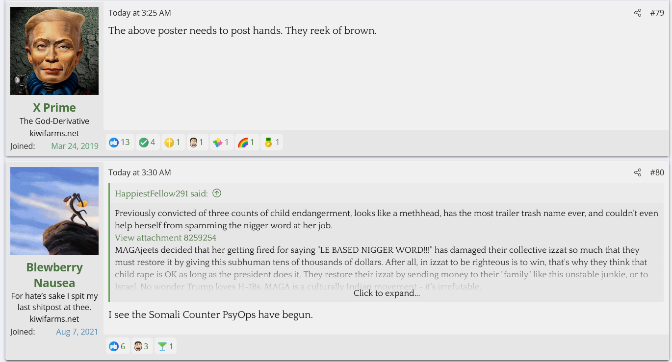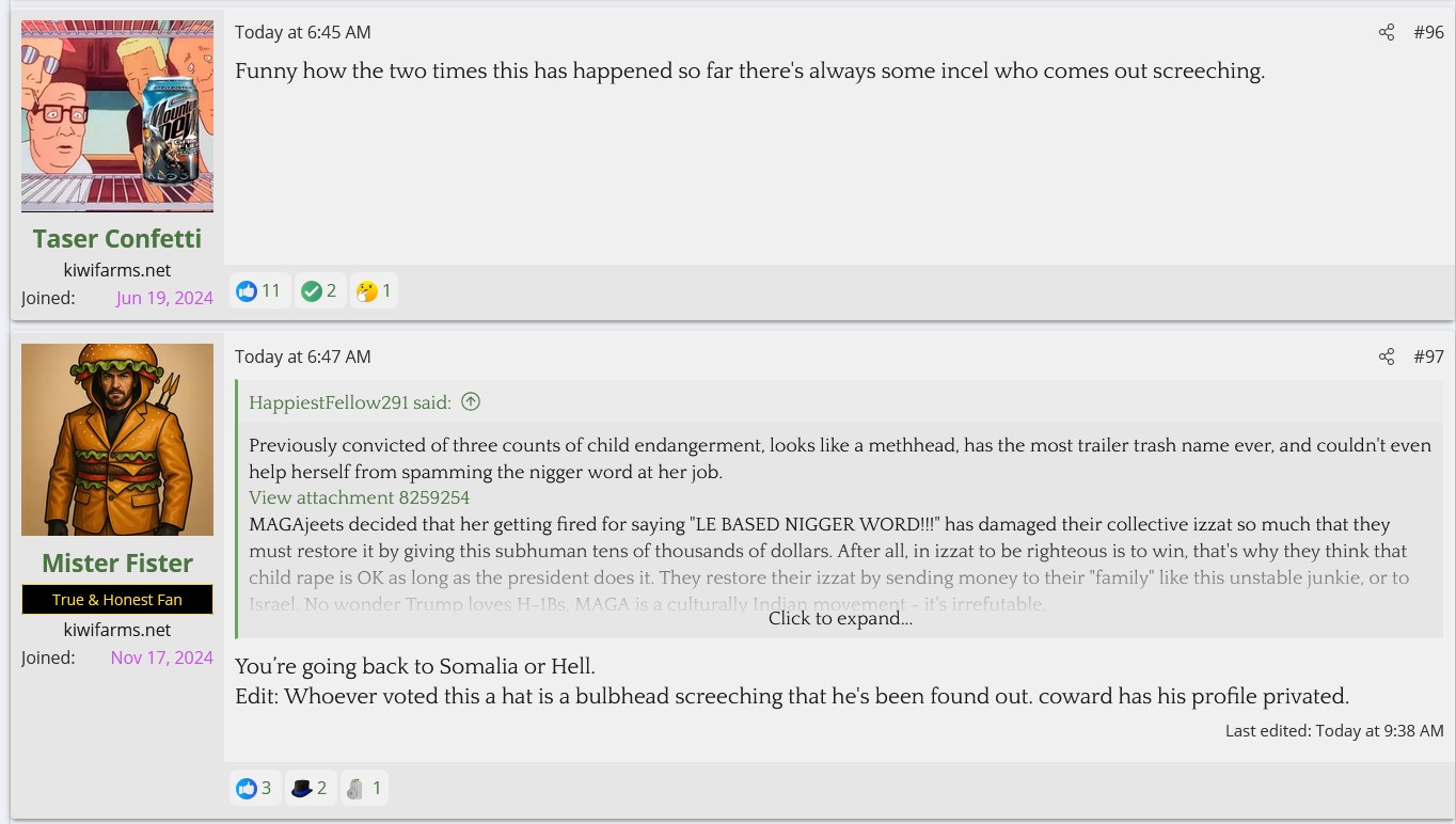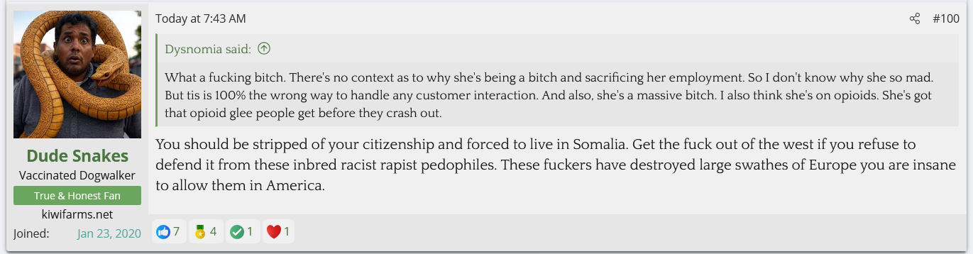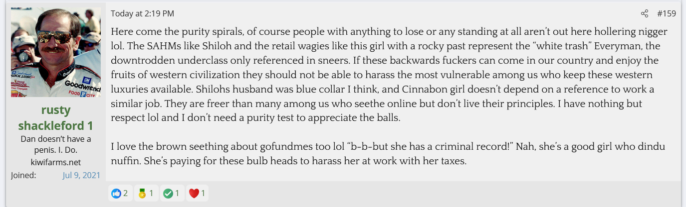 A Cinnabon worker with 3 child endangerment charges for driving drunk with her kids in the car was fired after sperging out on a Somalian couple and calling them slurs. She's gotten 70K so far. KF is defending her and saying they don't care about her criminal past and anyone who does is brown.