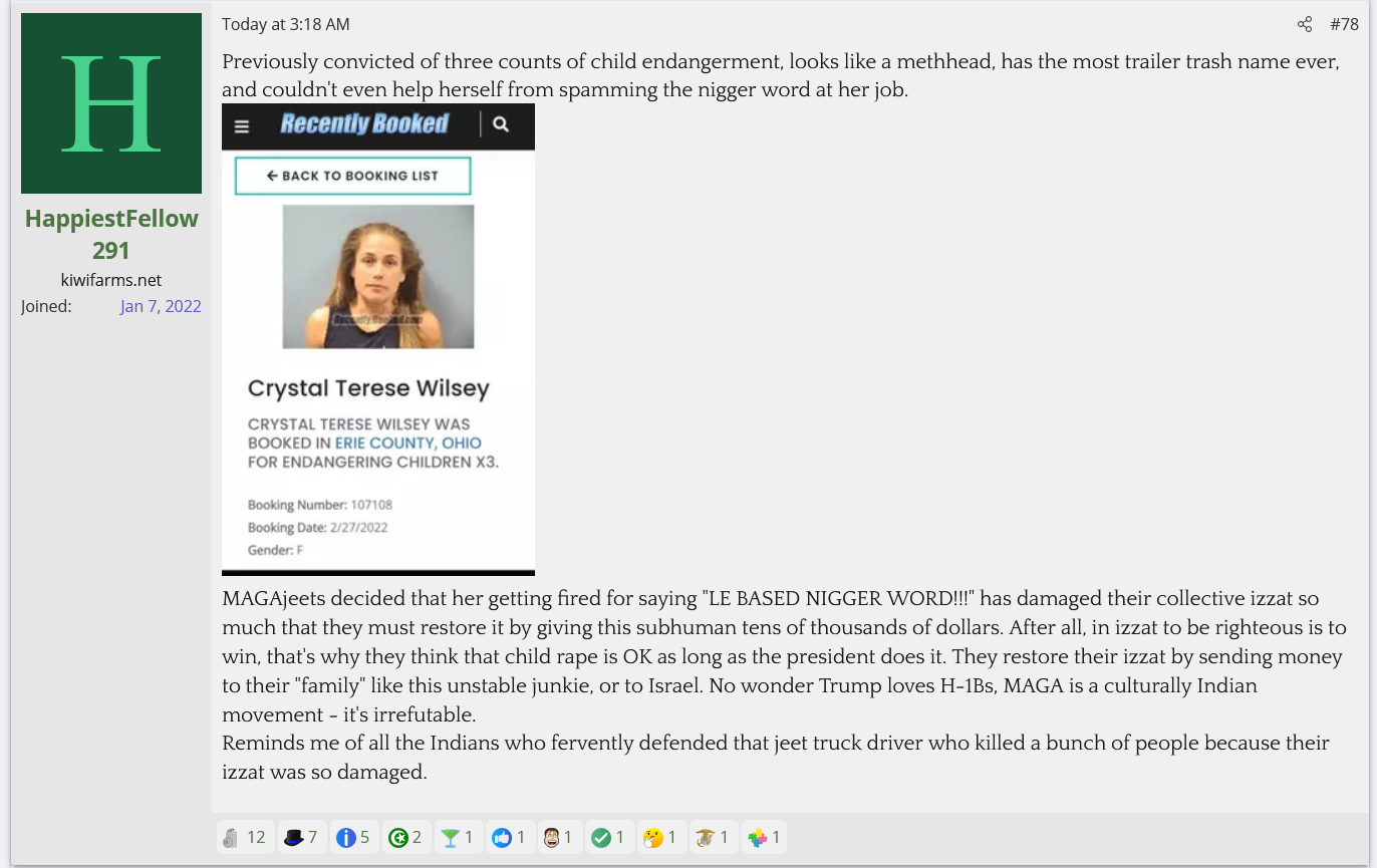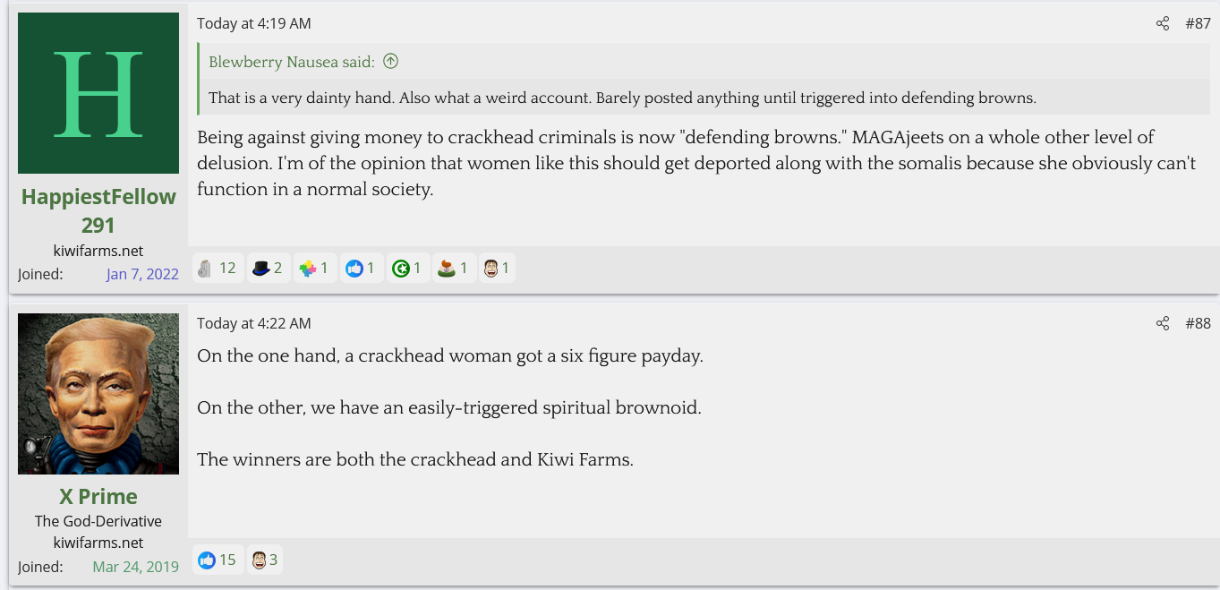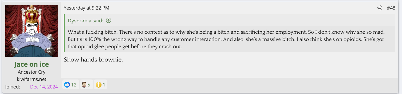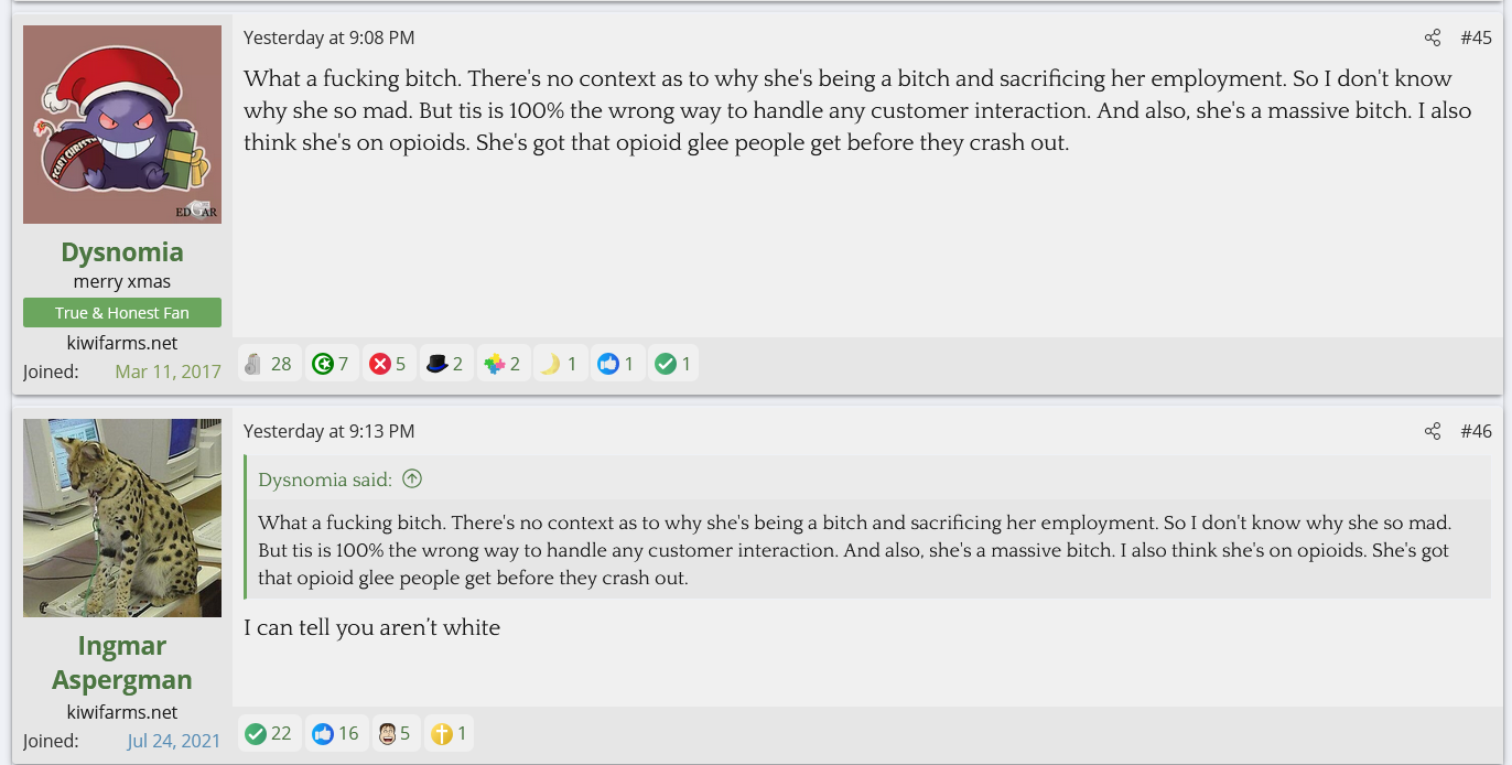 A Cinnabon worker with 3 child endangerment charges for driving drunk with her kids in the car was fired after sperging out on a Somalian couple and calling them slurs. She's gotten 70K so far. KF is defending her and saying they don't care about her criminal past and anyone who does is brown.
