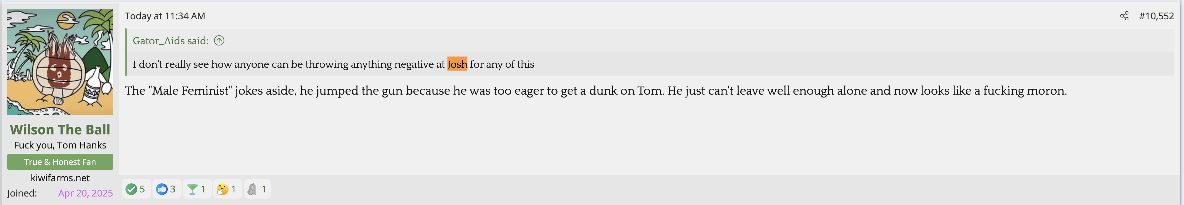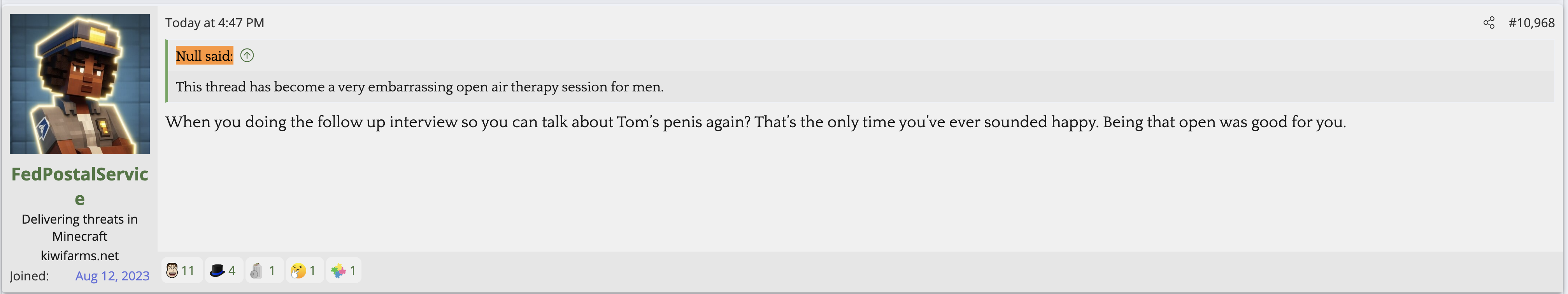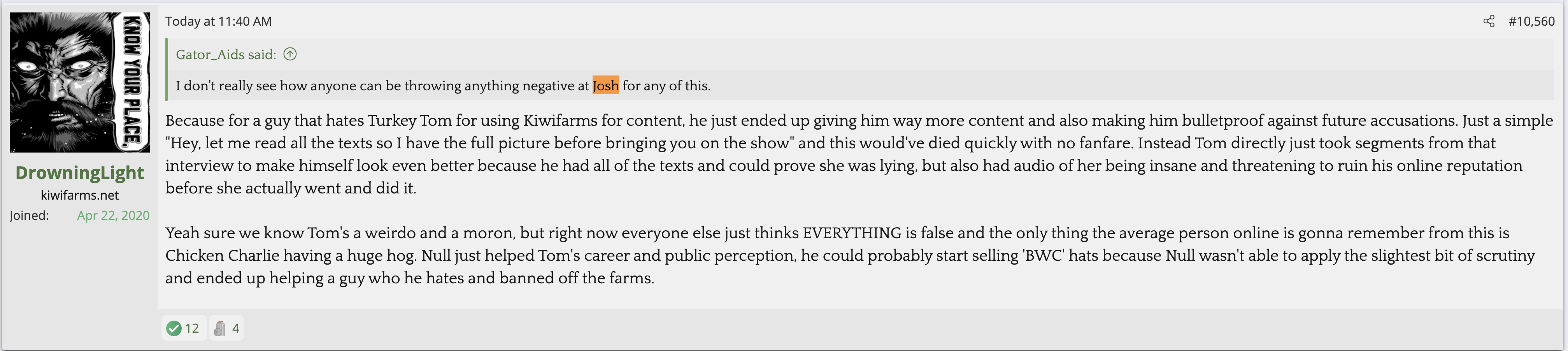 thefrogninja 🍉🍉 JDANKS420 🍉🍉 An Onion Among Onions Today at 9:44 PM #27,021 He's still coping about how poorly the interview went for him and how bad it makes his website look.