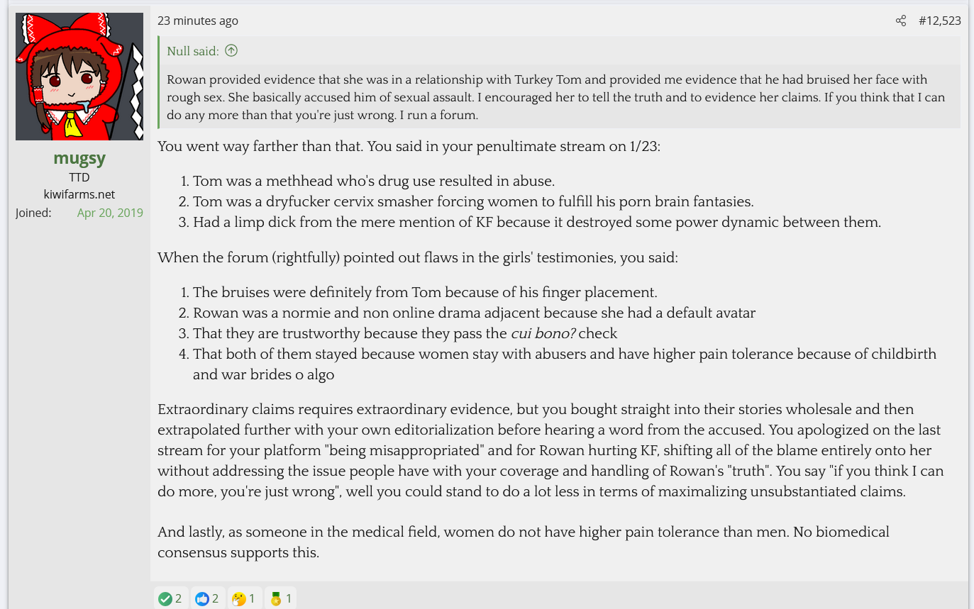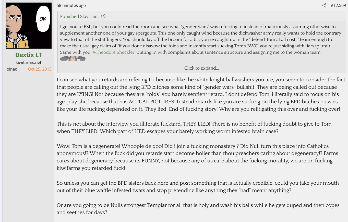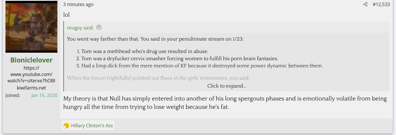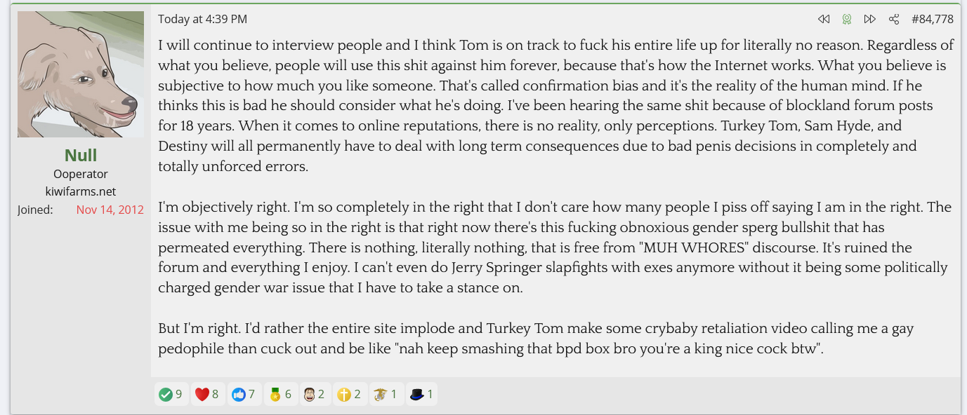 The Kiwifarms' is dying, slowly but surely. Null is aware of it. He's aware eventually his users are going to have families or careers or lives to lead and eventually stop caring about the farms, and all he's left with are the utter concentration of losers and mongs with no jobs.