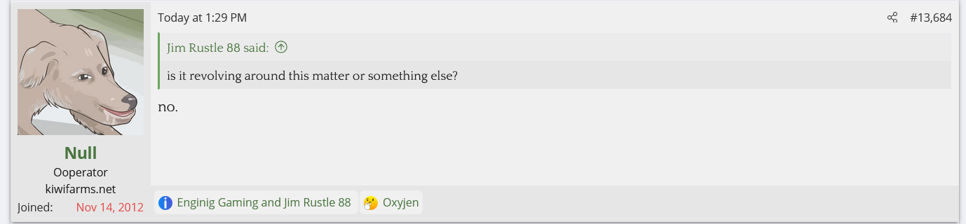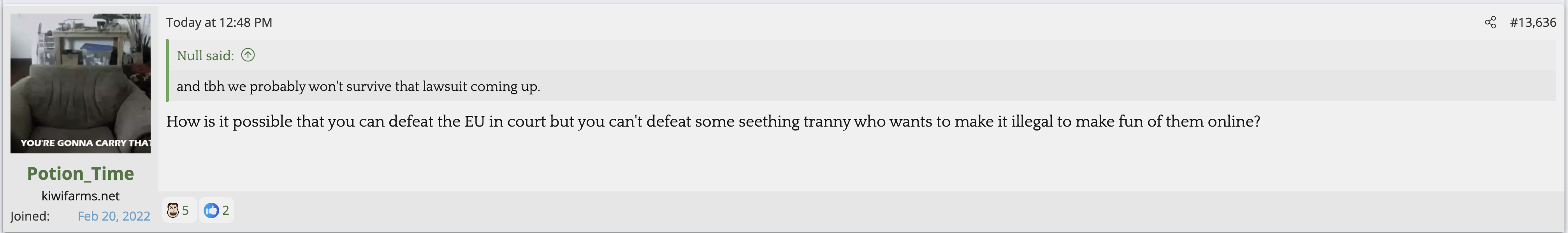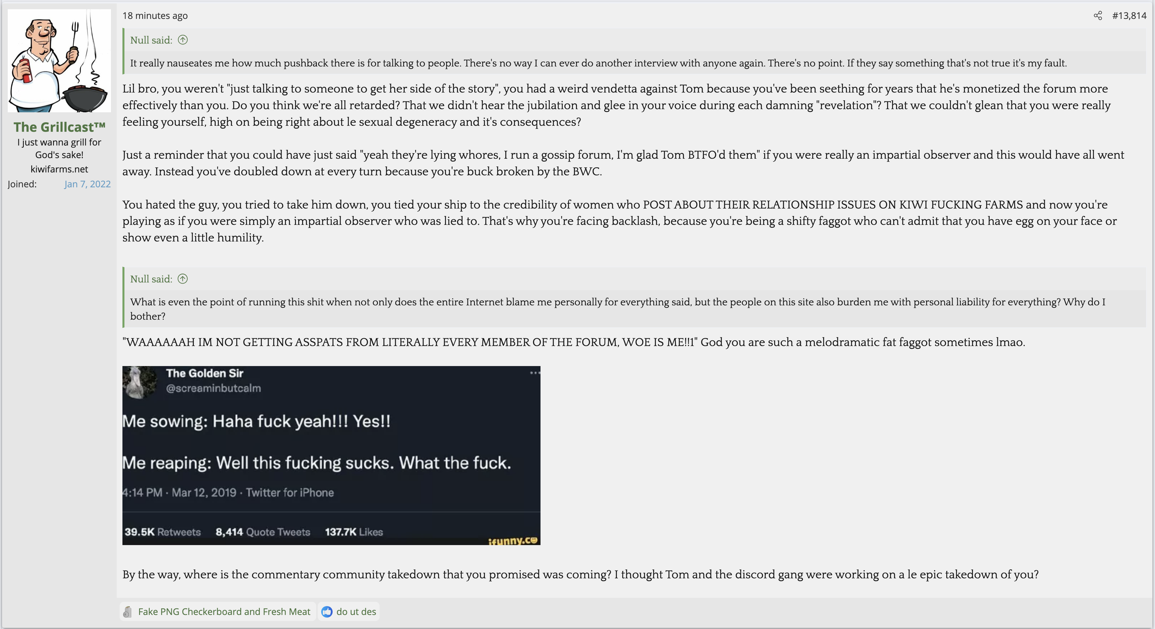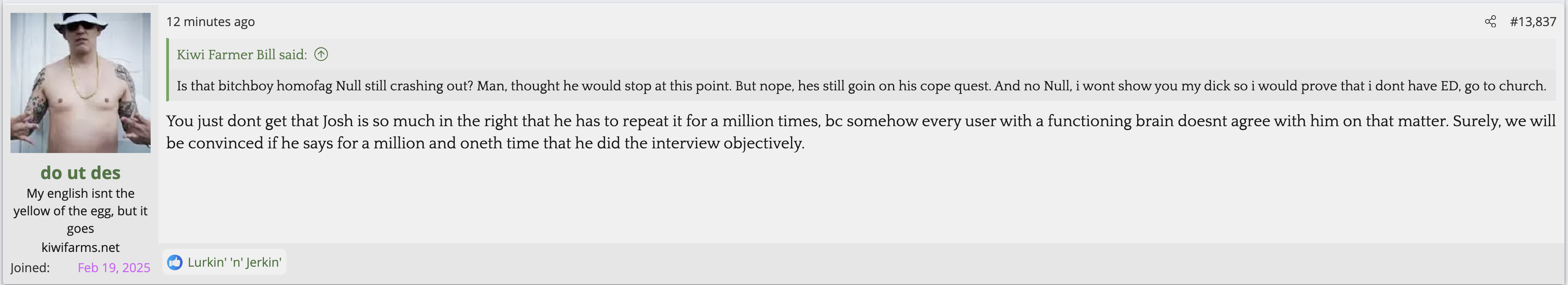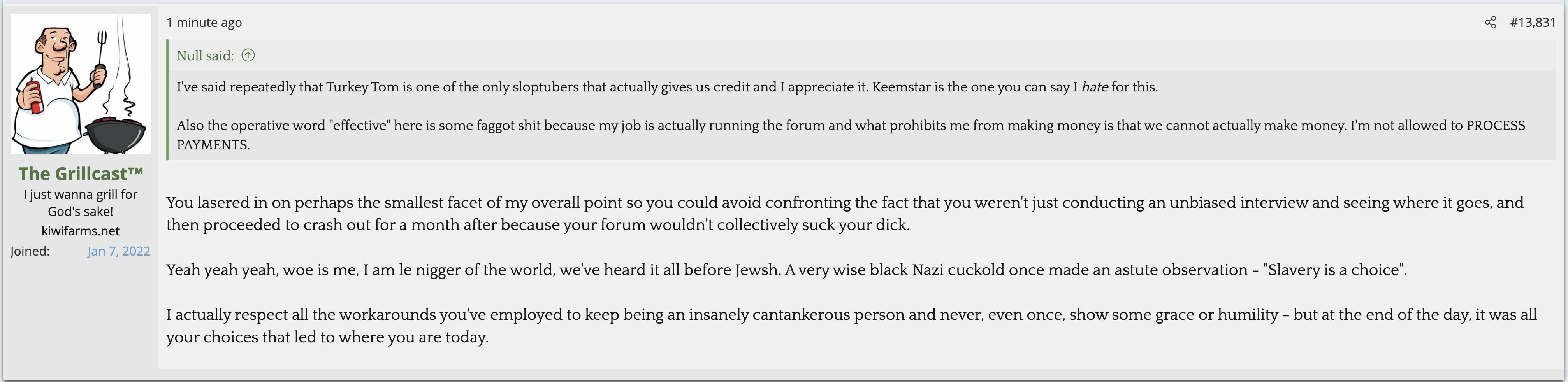 i love that post from Null about how he's apparently getting a lot of shit from the mods in their private "staff only" chat. they know he's a piece of shit with garbage views and Null has to defend the "miggers" from the mods. i don't know what it is about the site but it seems like everything really went to shit once the tranny took down the site. the humor slowly stopped being allowed. a lot of the banter where guys would post hot chicks or porn memes or make sexist comments slowly vanished. the userbase went from "its just pixels you annoying faggot" to "Rocky Horror Picture Show disturbs me" kiwifarms went from a refuge in a censored internet to being facebook.KF is very politically divided right now, to the point you have mods talking back to Null and saying they hate what he's turned Kiwi Farms into and that they'd rather have trannies on the forum than MAGA supporters.