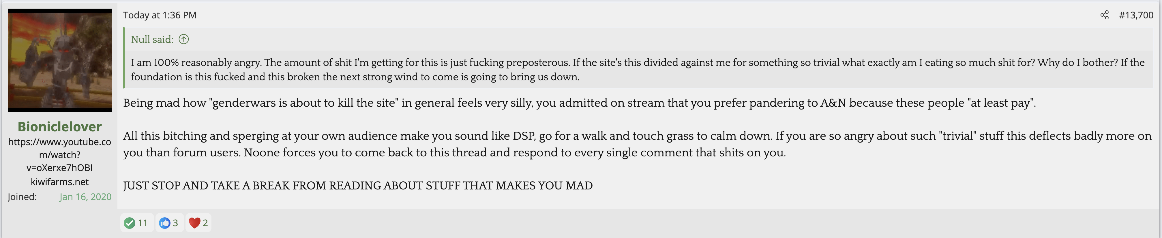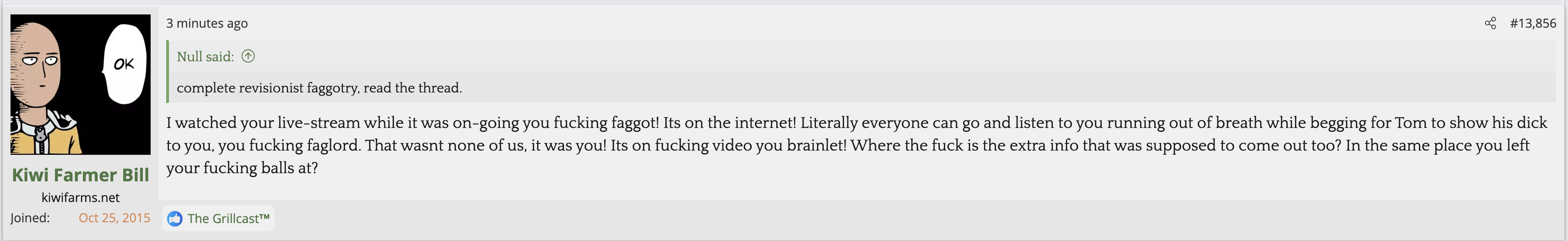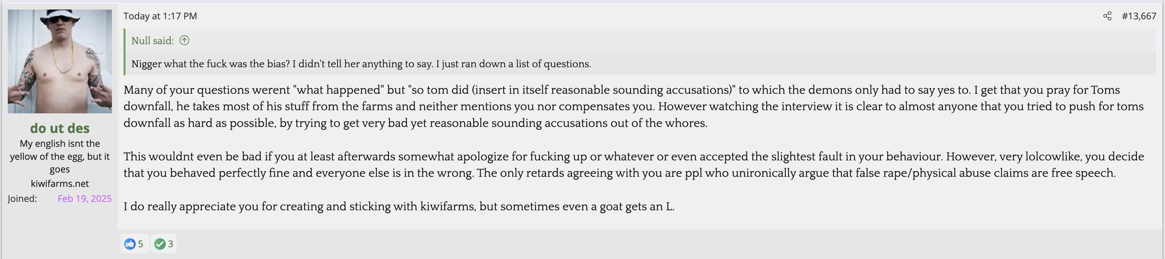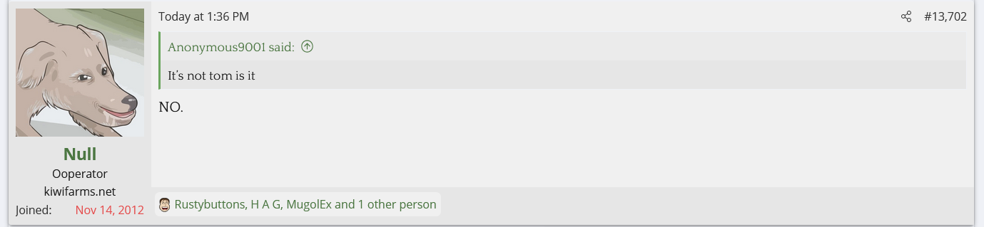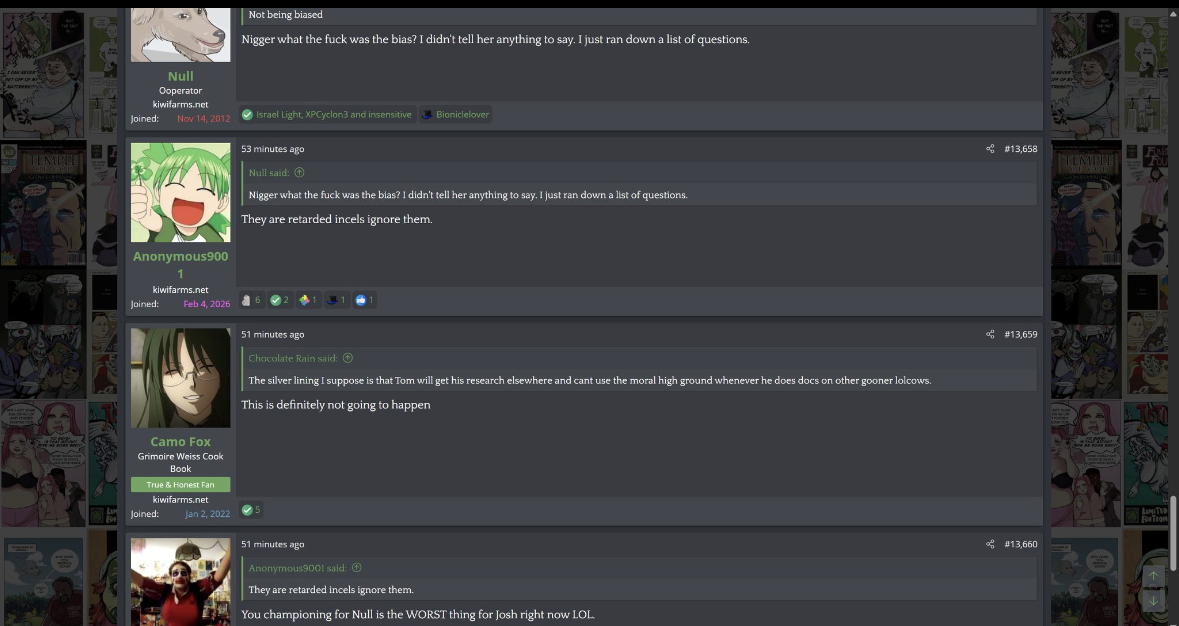 i love that post from Null about how he's apparently getting a lot of shit from the mods in their private "staff only" chat. they know he's a piece of shit with garbage views and Null has to defend the "miggers" from the mods. i don't know what it is about the site but it seems like everything really went to shit once the tranny took down the site. the humor slowly stopped being allowed. a lot of the banter where guys would post hot chicks or porn memes or make sexist comments slowly vanished. the userbase went from "its just pixels you annoying faggot" to "Rocky Horror Picture Show disturbs me" kiwifarms went from a refuge in a censored internet to being facebook.KF is very politically divided right now, to the point you have mods talking back to Null and saying they hate what he's turned Kiwi Farms into and that they'd rather have trannies on the forum than MAGA supporters.