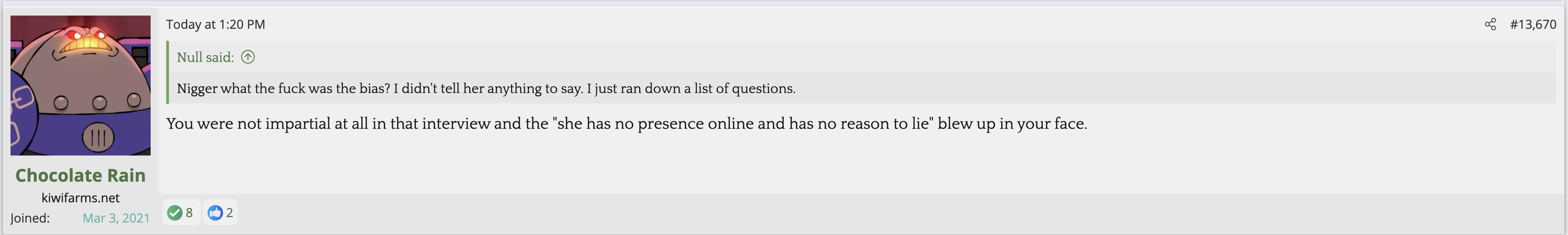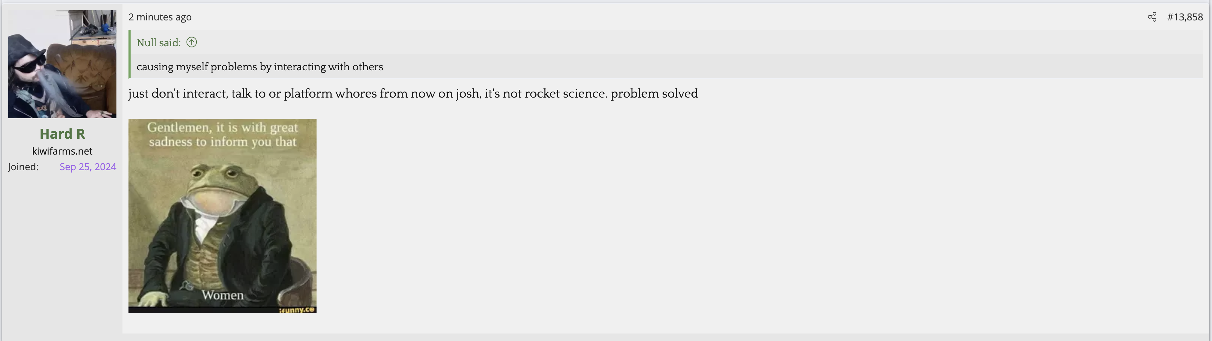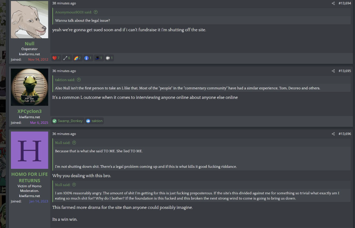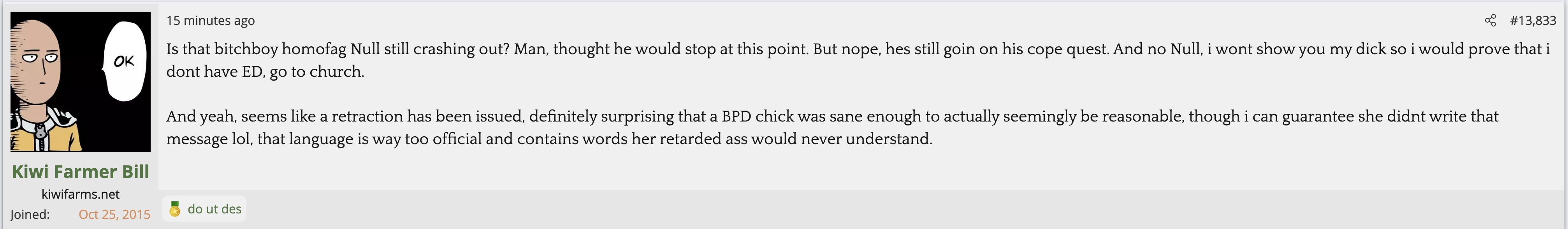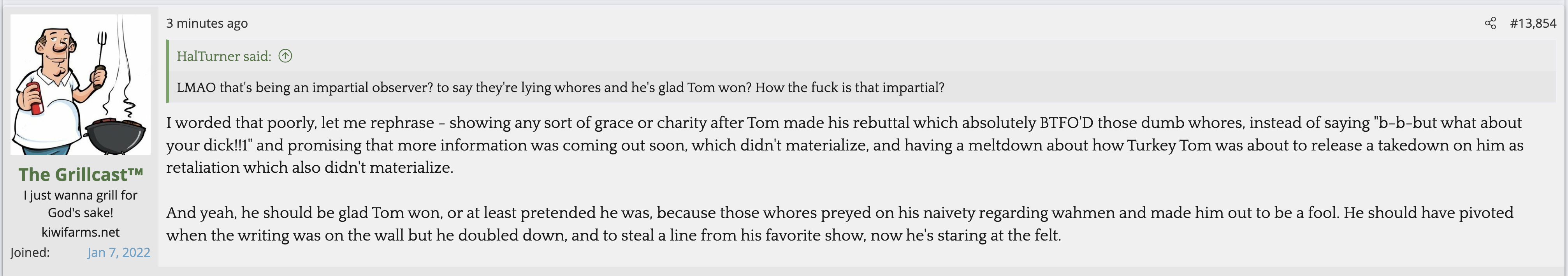 i love that post from Null about how he's apparently getting a lot of shit from the mods in their private "staff only" chat. they know he's a piece of shit with garbage views and Null has to defend the "miggers" from the mods. i don't know what it is about the site but it seems like everything really went to shit once the tranny took down the site. the humor slowly stopped being allowed. a lot of the banter where guys would post hot chicks or porn memes or make sexist comments slowly vanished. the userbase went from "its just pixels you annoying faggot" to "Rocky Horror Picture Show disturbs me" kiwifarms went from a refuge in a censored internet to being facebook.KF is very politically divided right now, to the point you have mods talking back to Null and saying they hate what he's turned Kiwi Farms into and that they'd rather have trannies on the forum than MAGA supporters.