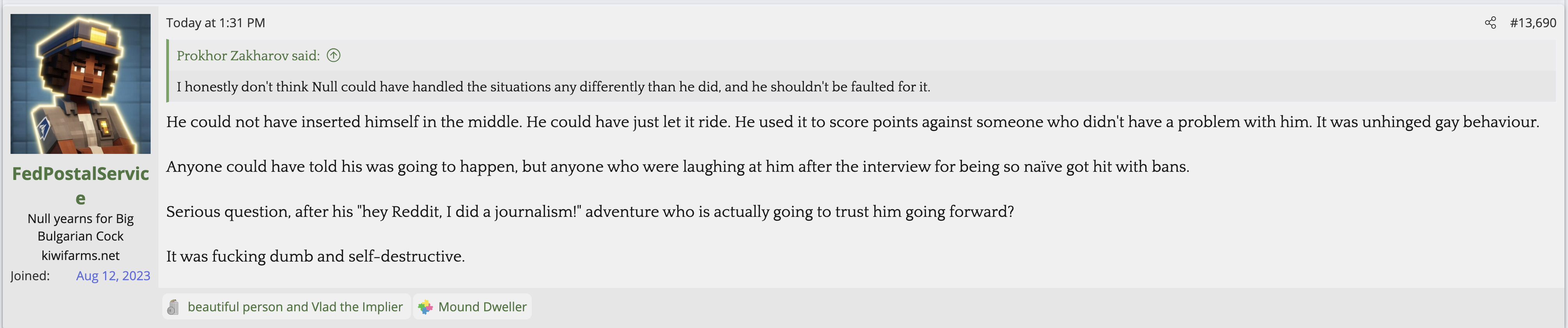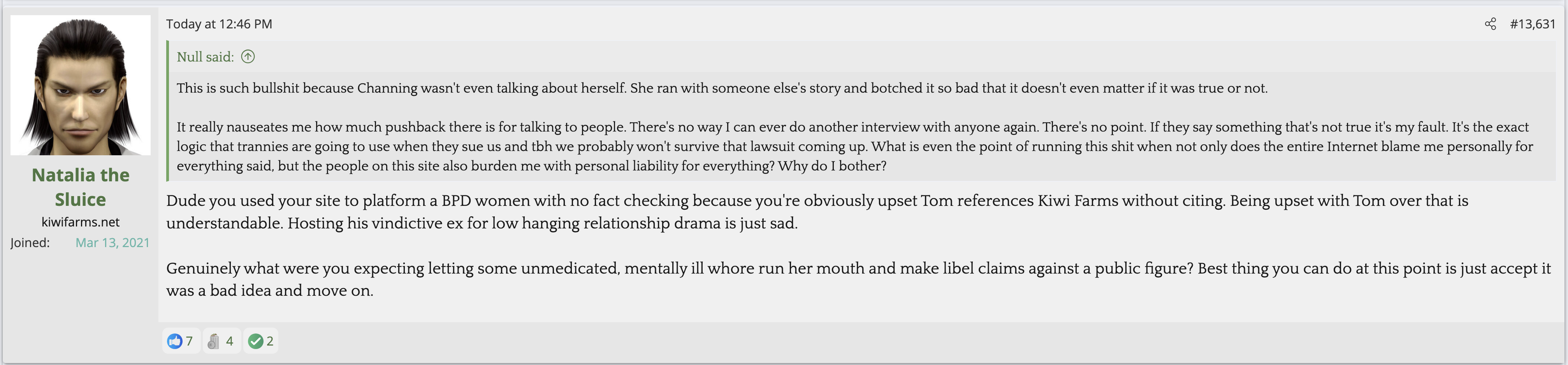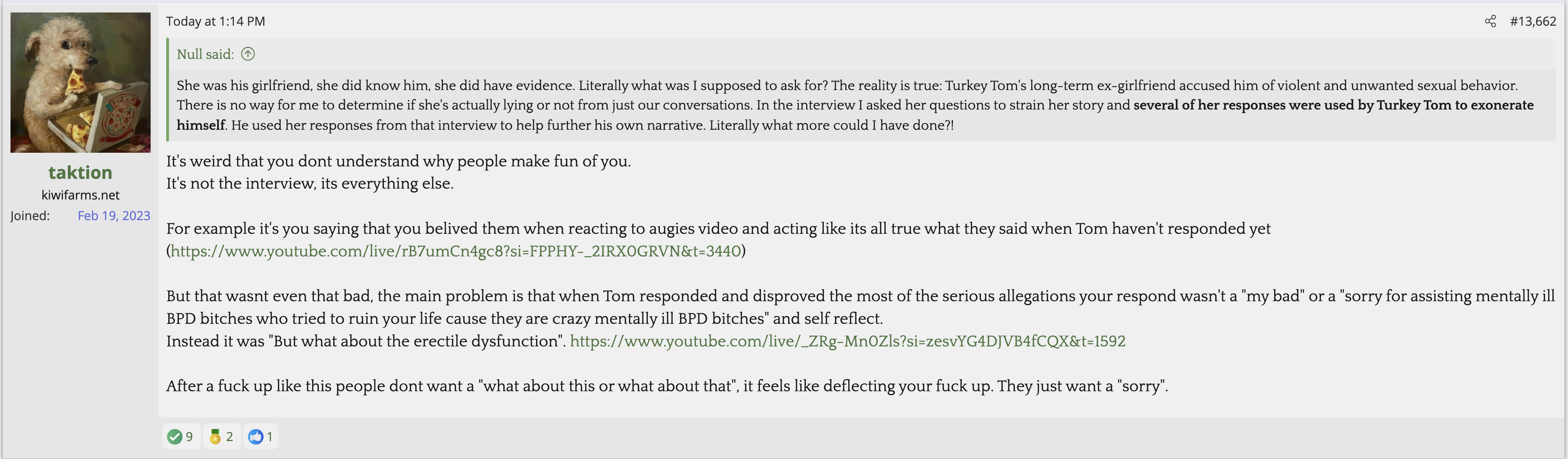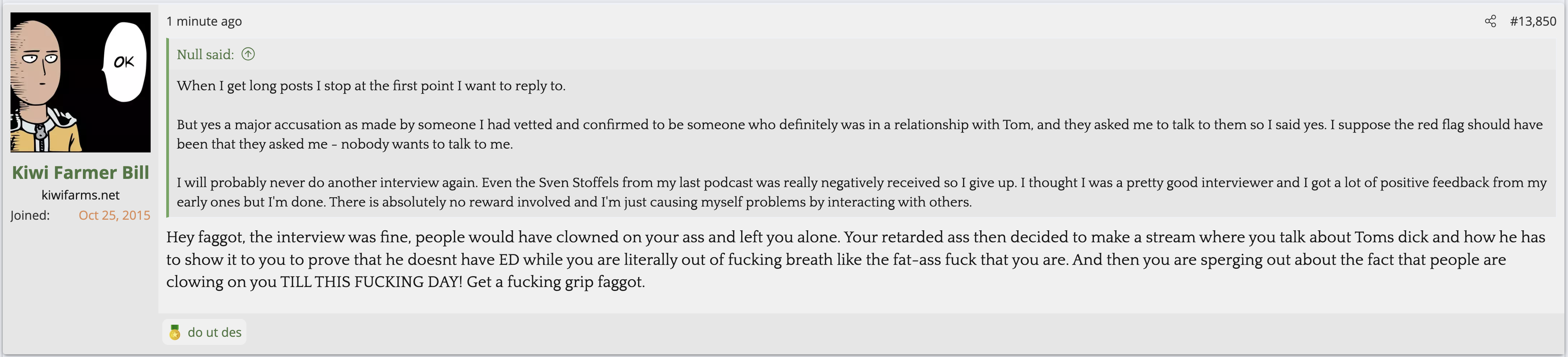 i love that post from Null about how he's apparently getting a lot of shit from the mods in their private "staff only" chat. they know he's a piece of shit with garbage views and Null has to defend the "miggers" from the mods. i don't know what it is about the site but it seems like everything really went to shit once the tranny took down the site. the humor slowly stopped being allowed. a lot of the banter where guys would post hot chicks or porn memes or make sexist comments slowly vanished. the userbase went from "its just pixels you annoying faggot" to "Rocky Horror Picture Show disturbs me" kiwifarms went from a refuge in a censored internet to being facebook.KF is very politically divided right now, to the point you have mods talking back to Null and saying they hate what he's turned Kiwi Farms into and that they'd rather have trannies on the forum than MAGA supporters.