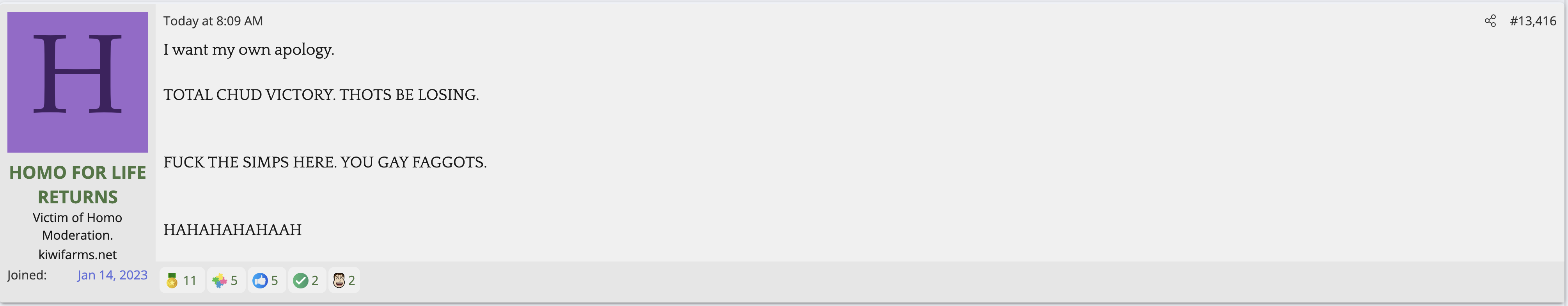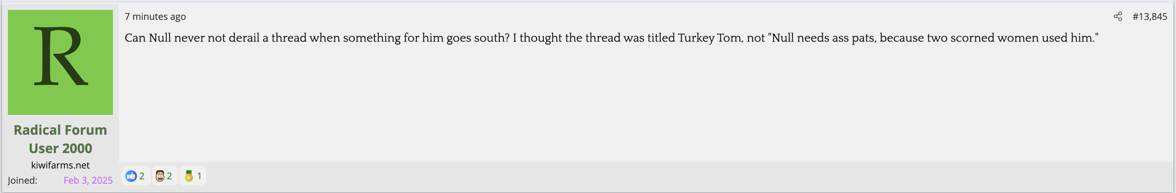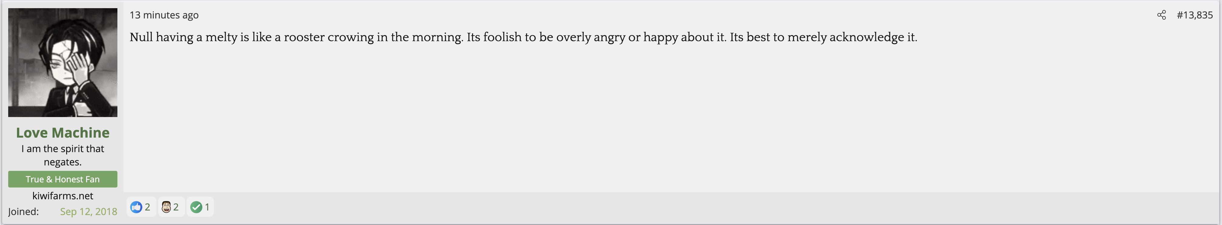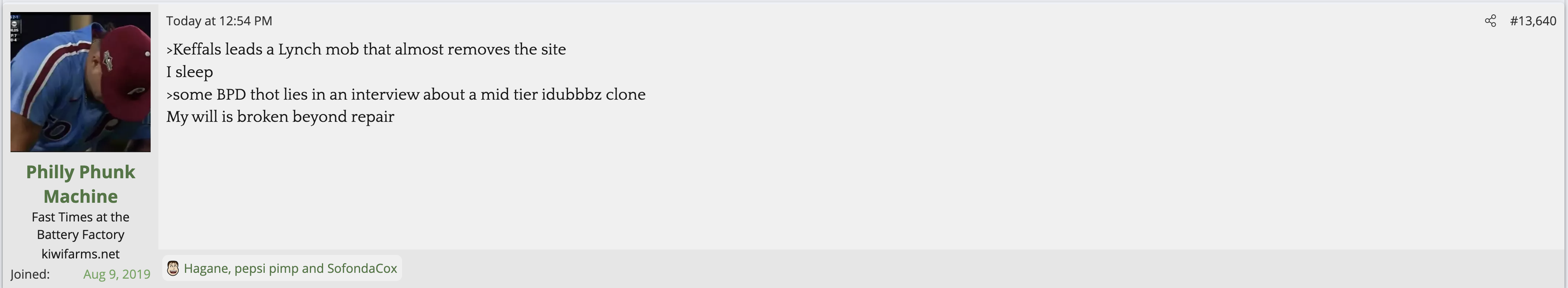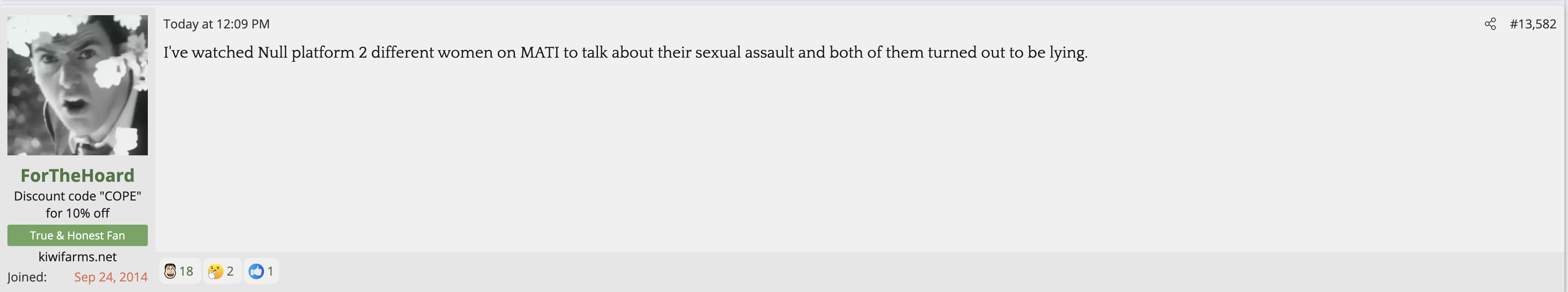 i love that post from Null about how he's apparently getting a lot of shit from the mods in their private "staff only" chat. they know he's a piece of shit with garbage views and Null has to defend the "miggers" from the mods. i don't know what it is about the site but it seems like everything really went to shit once the tranny took down the site. the humor slowly stopped being allowed. a lot of the banter where guys would post hot chicks or porn memes or make sexist comments slowly vanished. the userbase went from "its just pixels you annoying faggot" to "Rocky Horror Picture Show disturbs me" kiwifarms went from a refuge in a censored internet to being facebook.KF is very politically divided right now, to the point you have mods talking back to Null and saying they hate what he's turned Kiwi Farms into and that they'd rather have trannies on the forum than MAGA supporters.