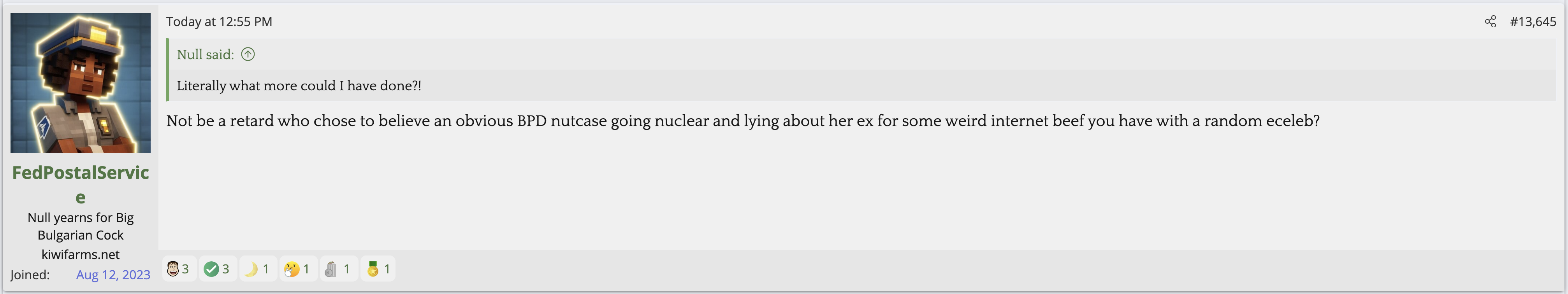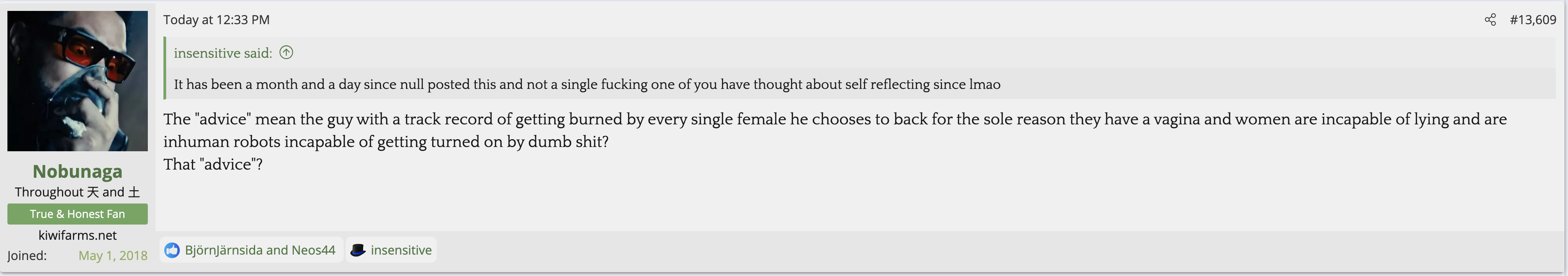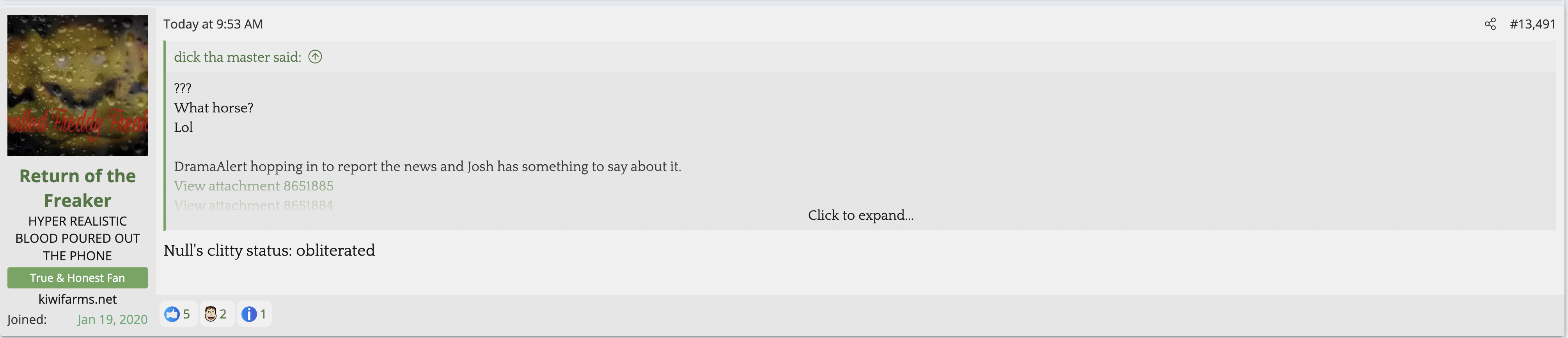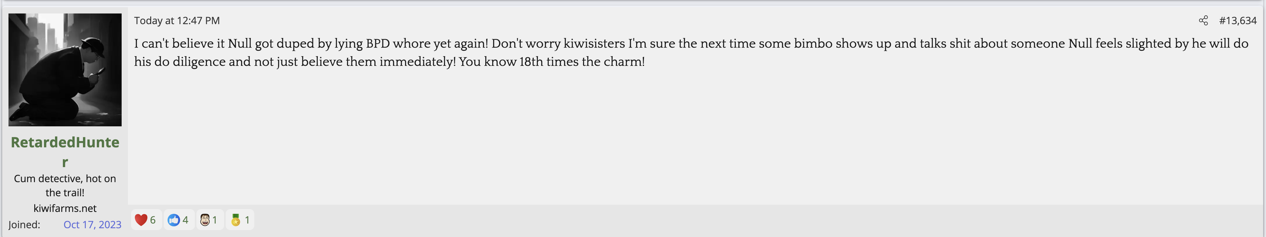 i love that post from Null about how he's apparently getting a lot of shit from the mods in their private "staff only" chat. they know he's a piece of shit with garbage views and Null has to defend the "miggers" from the mods. i don't know what it is about the site but it seems like everything really went to shit once the tranny took down the site. the humor slowly stopped being allowed. a lot of the banter where guys would post hot chicks or porn memes or make sexist comments slowly vanished. the userbase went from "its just pixels you annoying faggot" to "Rocky Horror Picture Show disturbs me" kiwifarms went from a refuge in a censored internet to being facebook.KF is very politically divided right now, to the point you have mods talking back to Null and saying they hate what he's turned Kiwi Farms into and that they'd rather have trannies on the forum than MAGA supporters.