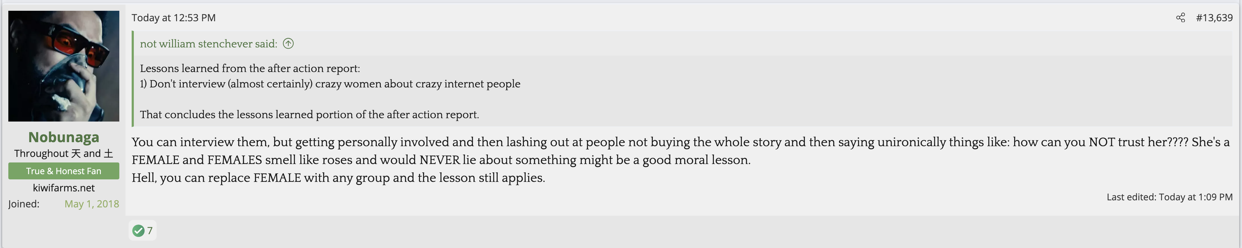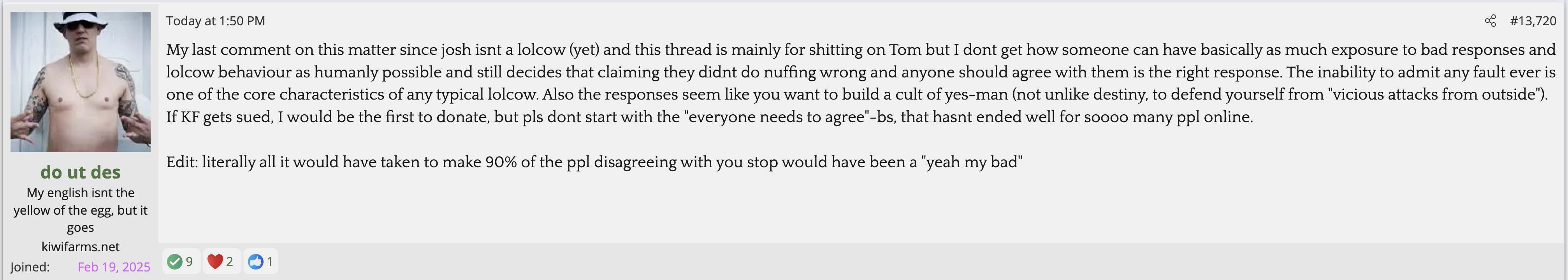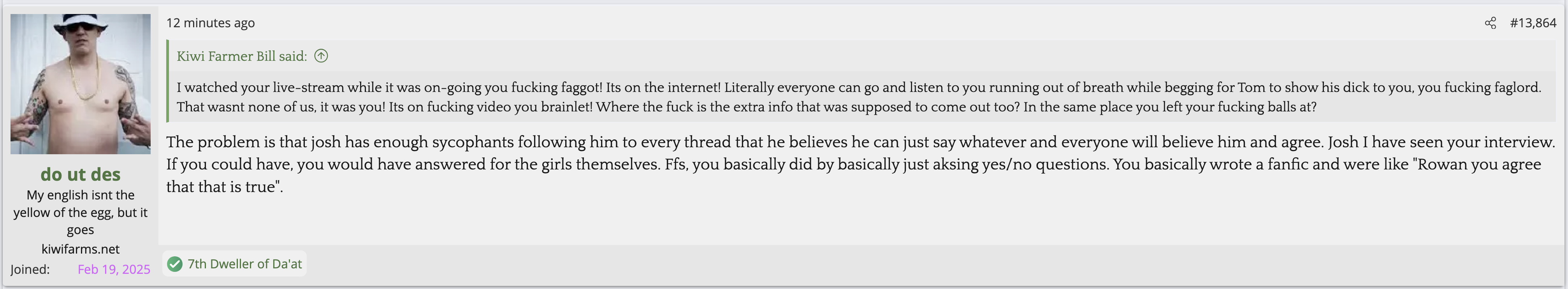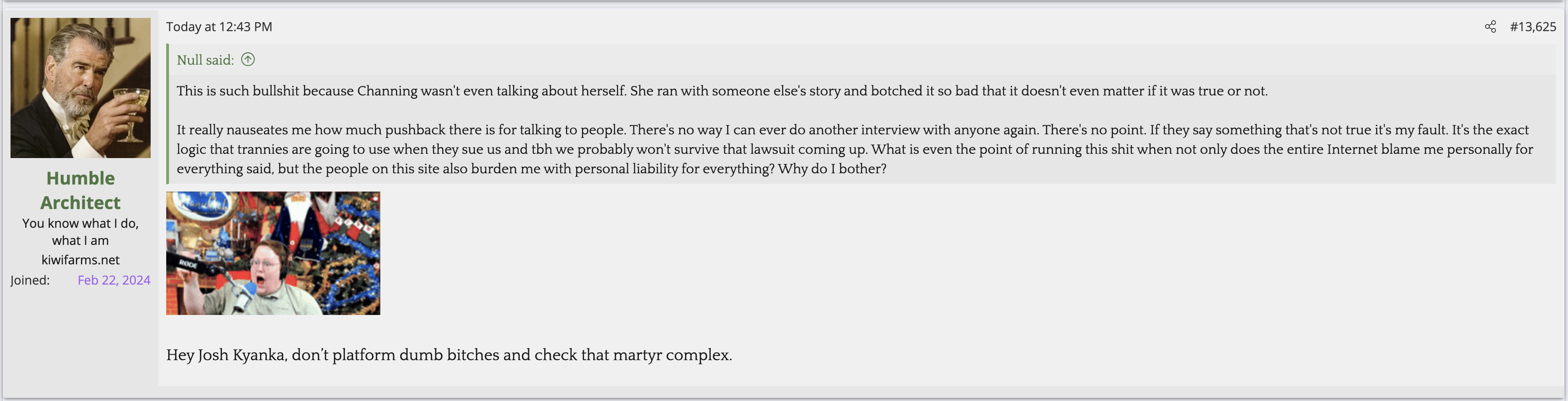 Not citing Kiwi farms is not a valid reason for butthurt. Kiwifarms steals so much content and doesn't credit people. They reap what they so.The forum is in full revolt as Josh is simply too autistic to understand (or pretending to not understand) the reason he is getting so much flak is not that he gave the women a platform to speak, but that he gave zero pushback whatsoever AND defended every accusation for weeks afterwards.