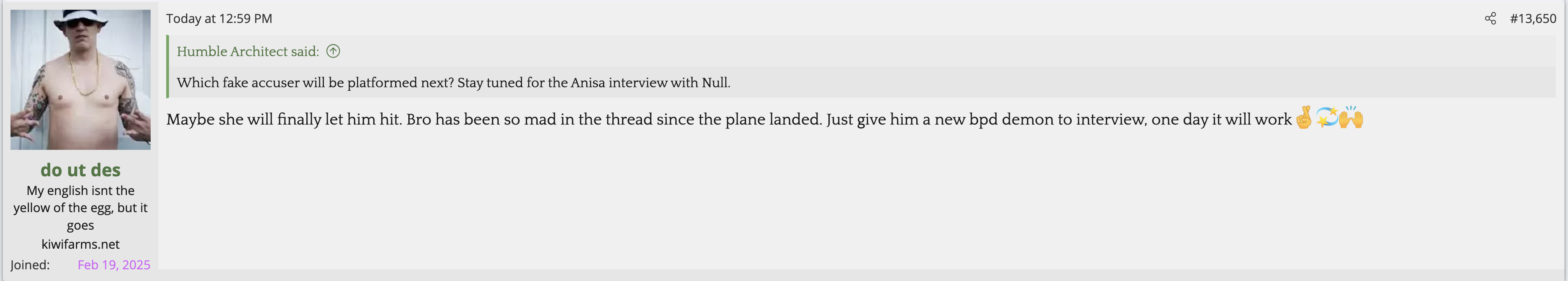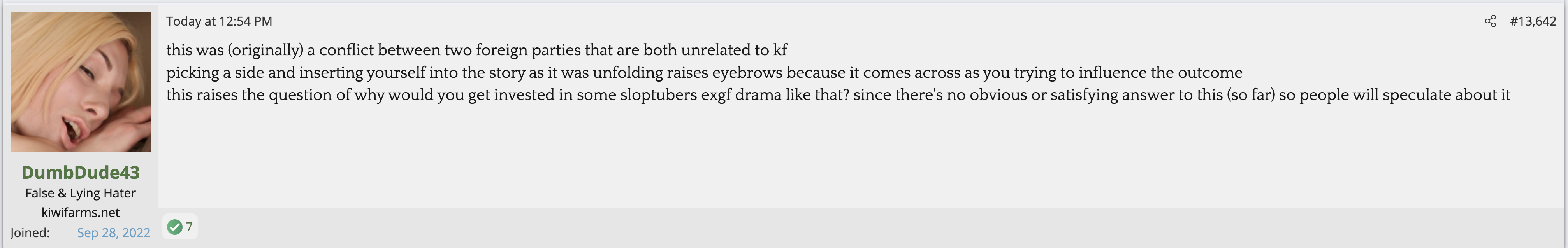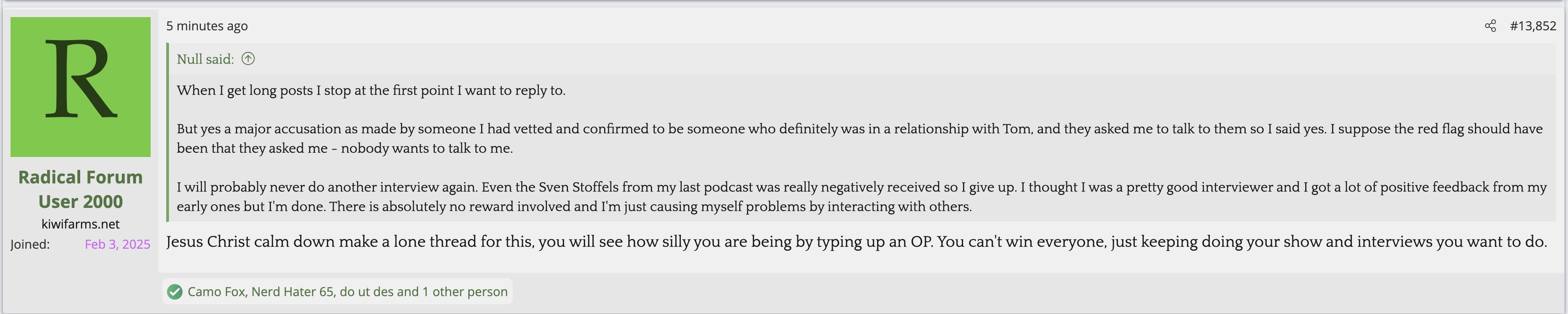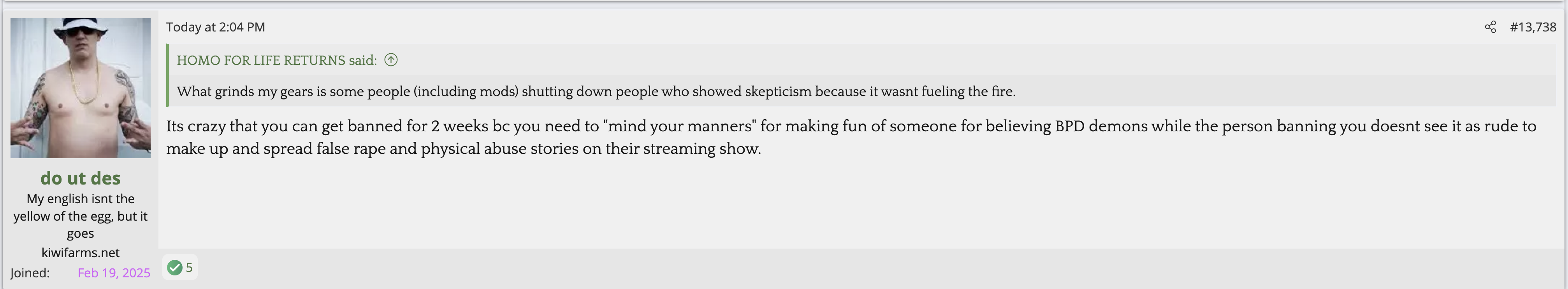Not citing Kiwi farms is not a valid reason for butthurt. Kiwifarms steals so much content and doesn't credit people. They reap what they so.The forum is in full revolt as Josh is simply too autistic to understand (or pretending to not understand) the reason he is getting so much flak is not that he gave the women a platform to speak, but that he gave zero pushback whatsoever AND defended every accusation for weeks afterwards.
