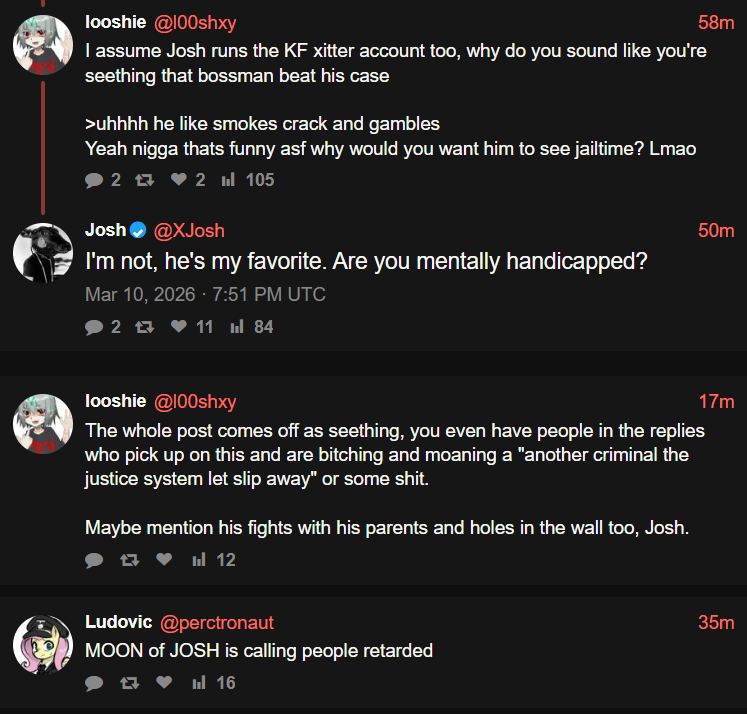 Kiwifarms user Sensitive Young Man has been banned for making fun of Josh, which most users did not mind and even found hilarious given the ratings. Josh paypig Solider of Wales tagged his Josh for the joke, then edited his post after getting called for it and removed the tag after realizing what a bitch it made him look, but it was too late.