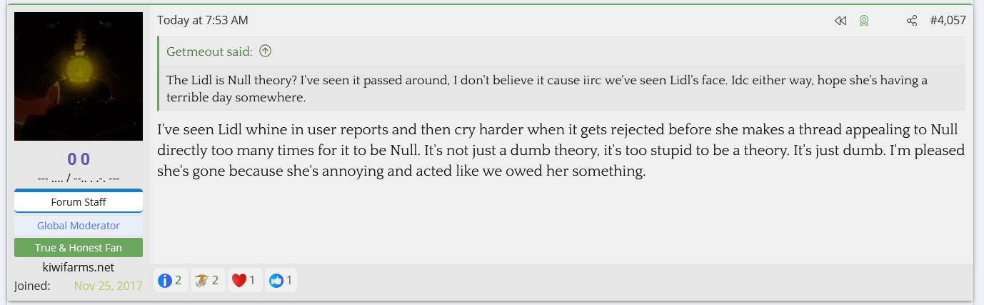 Personally, I'll believe Lidl is a real woman (or some other real person like a tranny or catfish) when the account starts up again and she jumps on a livestream from the account. There are just too many weird coincidences with Moon, going on with that account, for me to dismiss. Or to take a KF mod's anecdotal opinion over all those weird coincidences.