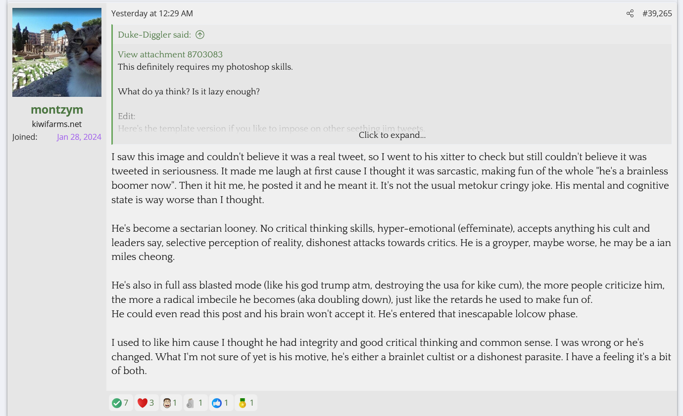 There are some gravedancers, but there are others who sympathize with Anglin and share the same views as Fount. Even Null expressed sympathy and said that he was feeling his age and didn't know how to respond to the growing amount of anti-Jewish Groypers among the right. I posted it in the last few pages of this thread.
