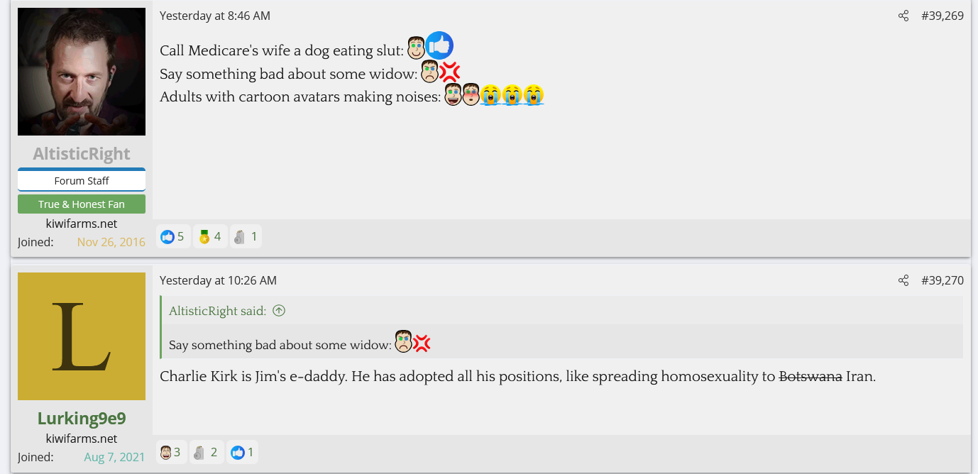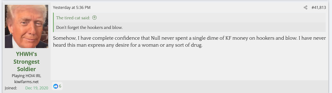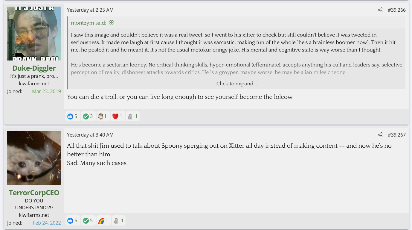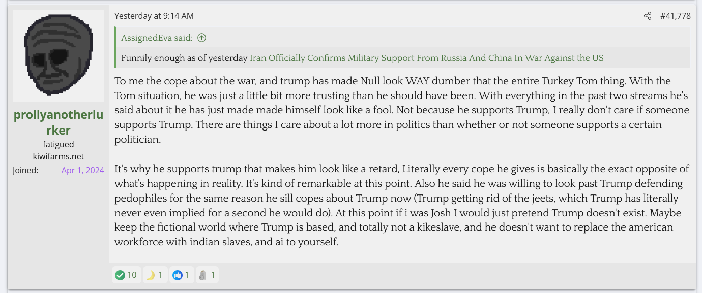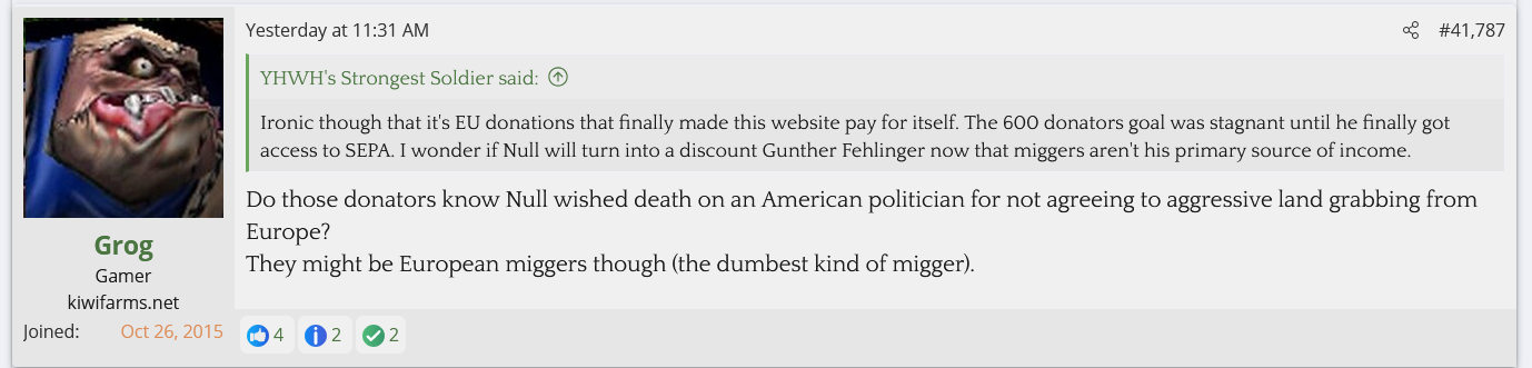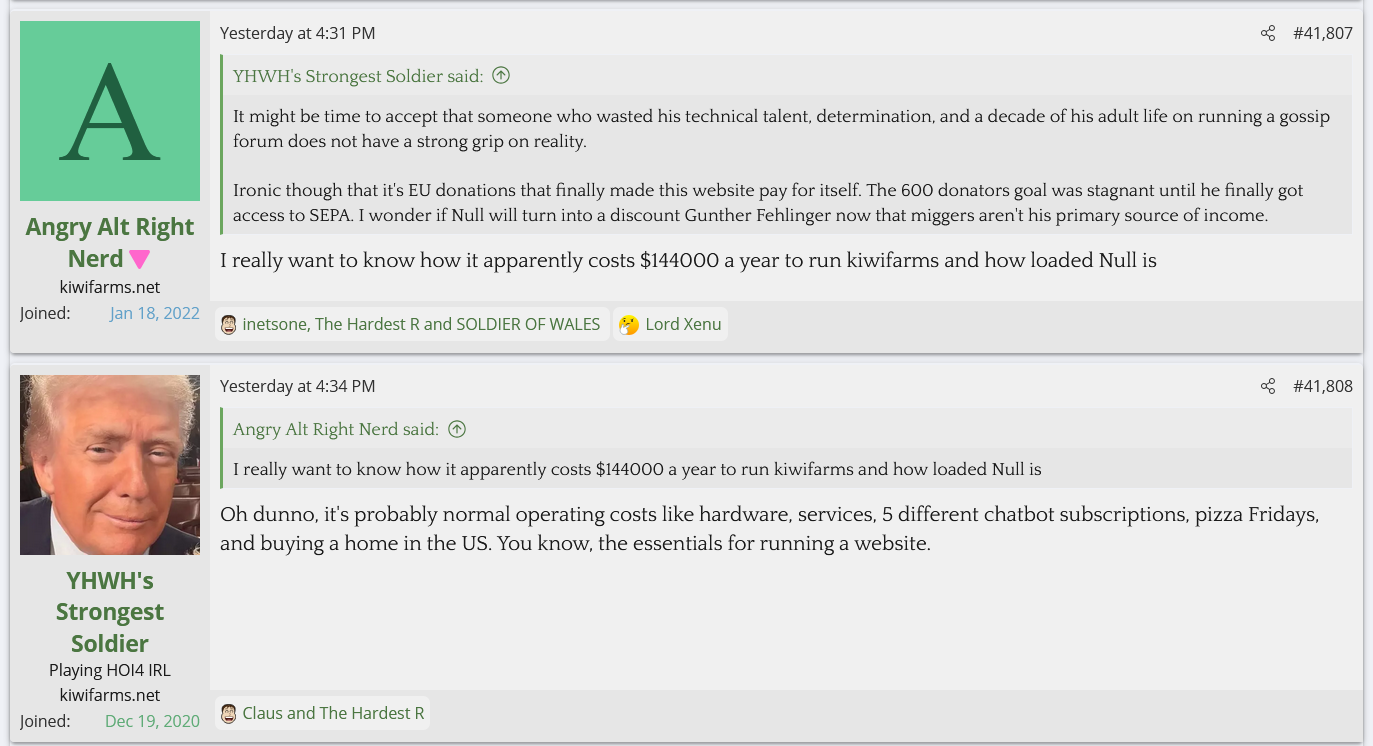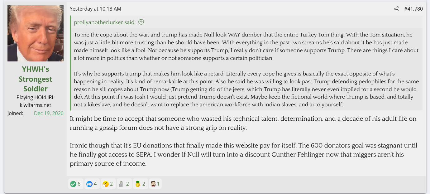 Is he afraid of them? Is he so checked out of running Kiwi Farms beyond the money angle that he doesn't care? It's not like he's ignorant of it either, the TES thread has tagged him into there multiple times to mock him for shilling Trump, and yet nothing is done about them despite them being one step away from saying he should be sent to a gulag for hate speech. These people will inevitably turn this frustration and hate onto Null if he doesn't do something about it.