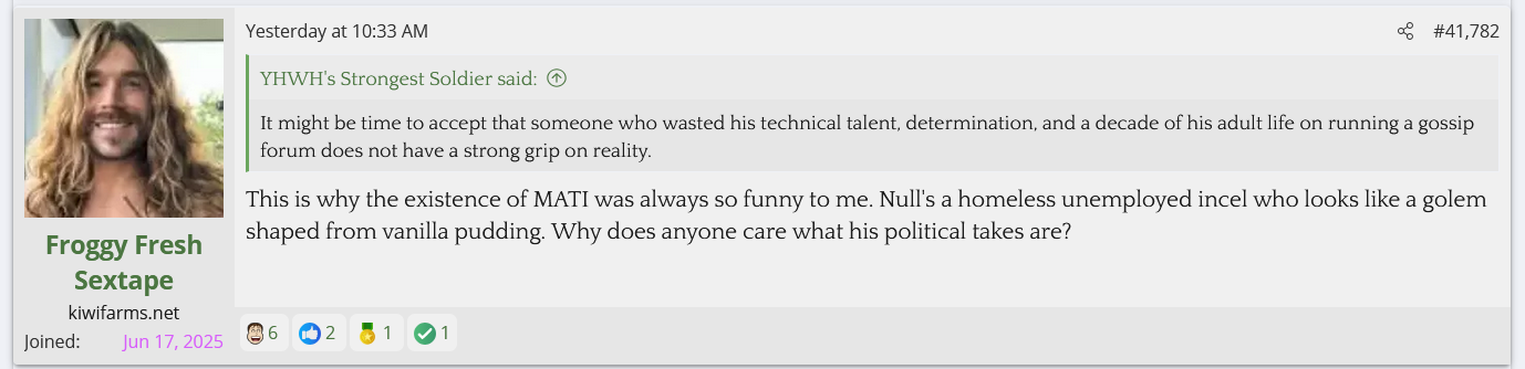 This is what I'm talking about. How has Null let this slide? He used to nuke dozens of accounts at once on threads like the DSP one for telling him to fuck off, but these guys get to openly mock him, tell people to not donate to him, laugh at the idea of him having any kind of platform, accuse him of being gay and wasting his donation money on personal vices, and saying he's "a homeless unemployed incel who looks like a golem shaped from vanilla pudding." I wouldn't be shocked if these guys eventually start bringing up neko shota.