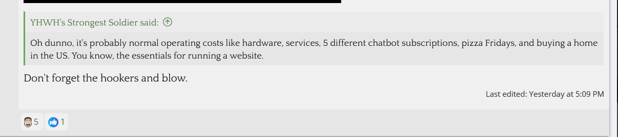 What would you have Josh do, in the Metokur thread? Ban them for shitting on Metokur? I think all that is valid criticism. I would doubt most of those alogging Metokur are leftists. Some probably are. But if you read that thread, a lot of criticism comes from former fans or hardcore viewers of his that now disagree with him over Vtubing, the Iran War, Covid, his health issues, his neocon politics, love for Trump, his laziness, his fake retirement, him crying about Charlie Kirk, etc. There is now quite a lot to disagree with Metokur about or laugh at him over.