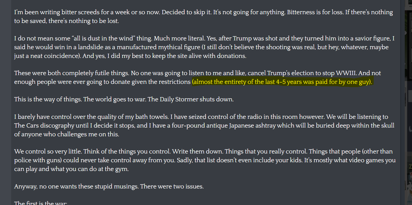 I think I figured out where your quote came from. Are you conflating it with something else? In a recent stream, Josh cries that back in January 2025 he only made $645. Then 10 minutes later he starts talking about Andrew Anglin shutting down his website Daily Stormer. Anglin is the one that said his website was funded by one guy for years. Not Josh.Josh himself said he has been funded this entire time by a single person, that was the first post I ever made on this account and nobody bothered to find the source for it... It's a direct quote from Josh, "I have been funded by a single person all these years".