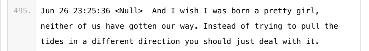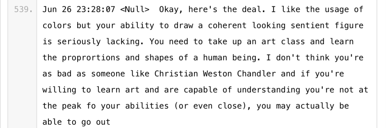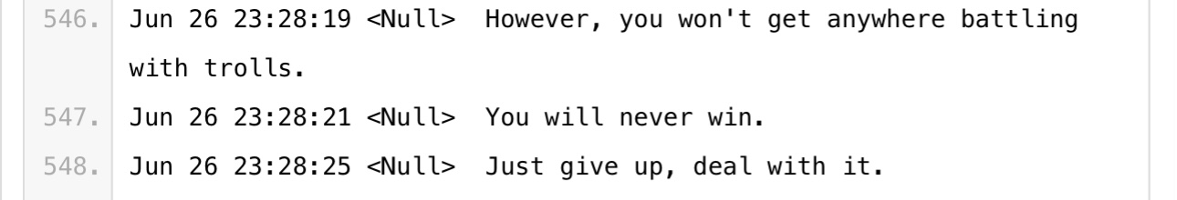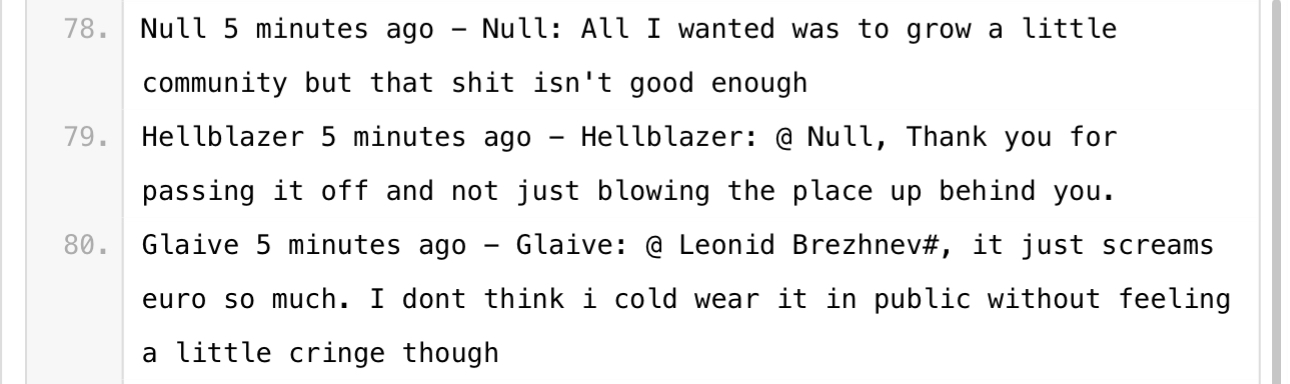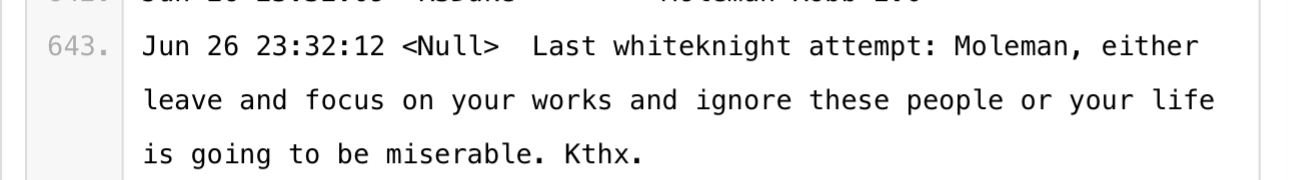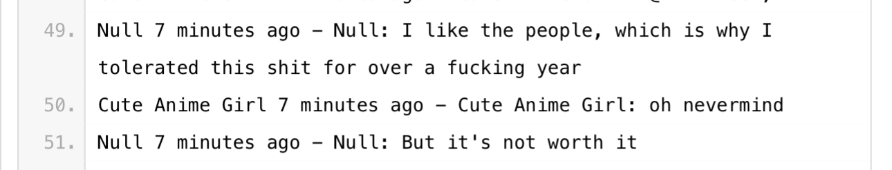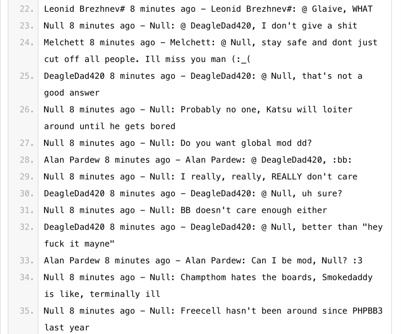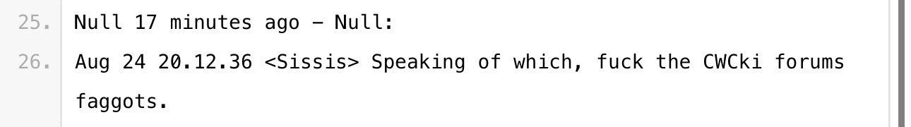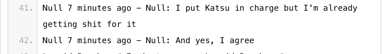 Next, we have some very weird chat logs. So what’s happened here is, Null and his friends were interacting (hard to tell which platforms) and someone decided to archive the whole conversation and post it on Pastebin for preservation. (Thank you hero of the farmers Anon that I will probably never encounter)