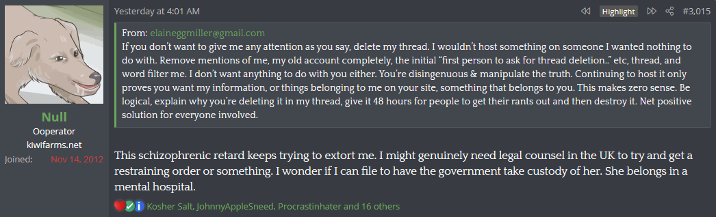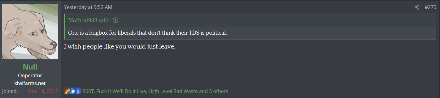 I can't completely blame Null for how the site has become politically. It became widely know as a "free speech bastion" in 2018 when Null told the New Zealand investigator asking for user IP's to go fuck himself. His only real choices then were to give in and get declared a cuck or tell them no and get a bunch of right-wing people thinking he's the second coming, and it can't be downplayed how pervasive the "culture war" was throughout 2016 to 2020 and still is. Null also still believed in free speech back then before 2020 broke him. What I can blame him for is continuing to lie about still wanting to fight for other's rights, grift money and support from desperate people and then wail about how those same people are killing his site and how much he hates them and publicly blaming them for all his site's problems.