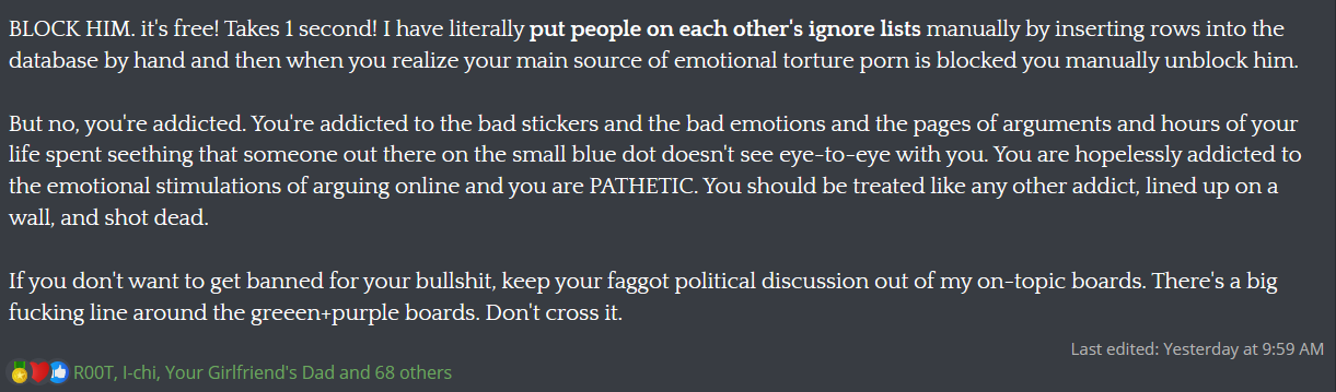 The thing is if Josh really wanted KF to be free of this stuff then he needs to be ruthless about banning and excising the people who indulge in this behavior. The site is terminal for politispergery. If he bans the people who act up, closes registrations for a year, and encourages more discussion of lolcows and less wailing about Biden, then he could make the site fun again.
