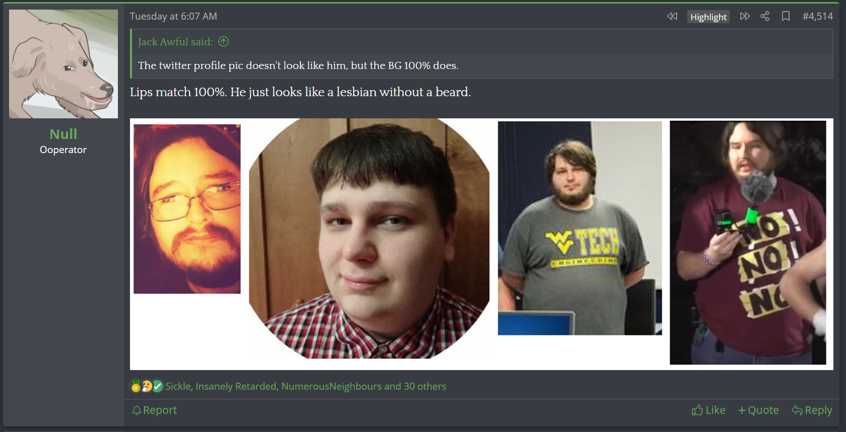 Feels like Null is “Winning Guys!” :/That time Trannymura convinced Josh the Gator faildox (which he had foreknowledge of) was legit, revealing is autistic facial blindness.