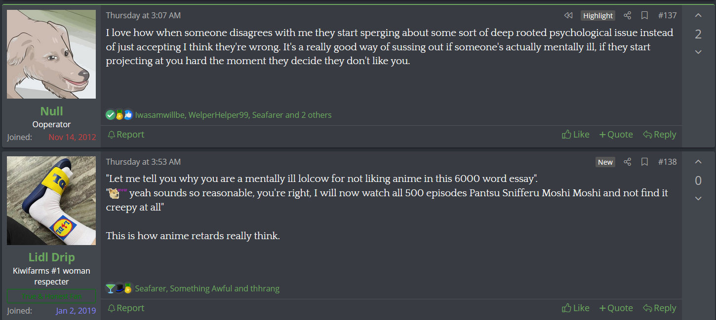 If anything ever vindicated Null it was him admitting that he changed his views on loli after 9chan.I don't think he's a pedophile (I'm really getting tired of the whole "is Null a pedo" discussion), I think Null is sexually traumatized and hence has a kneejerk over-reaction to any image that remotely shows children's bodies. Take for example that screenshot he included here on the right: