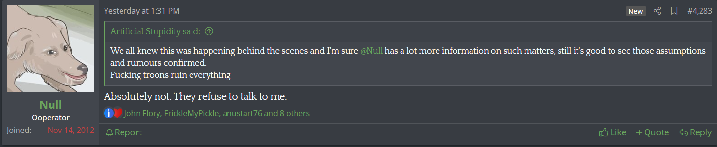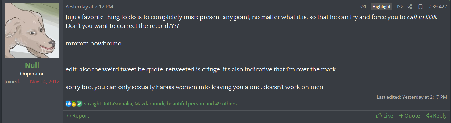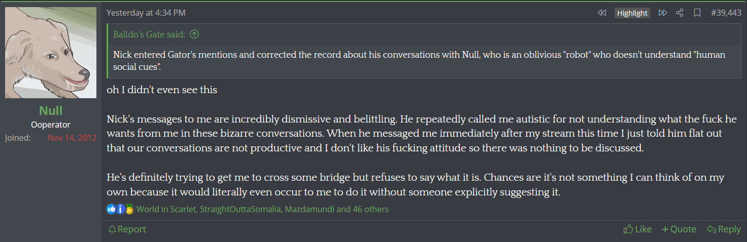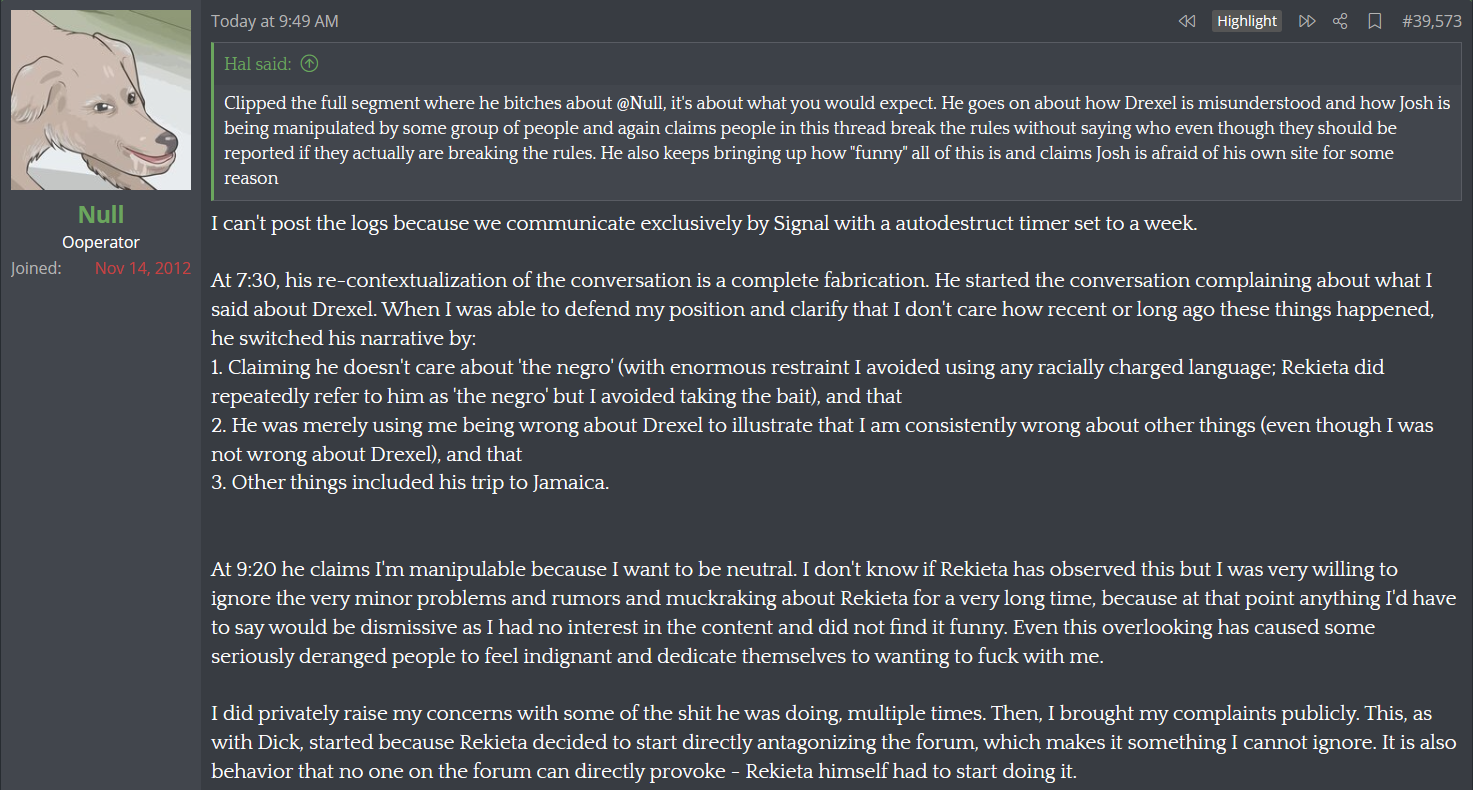 He's turning the whole site into being directly about him you can not even escape it anymore in any thread without Null coming in and writing paragraphs about some shit that does not matter. Sickening.