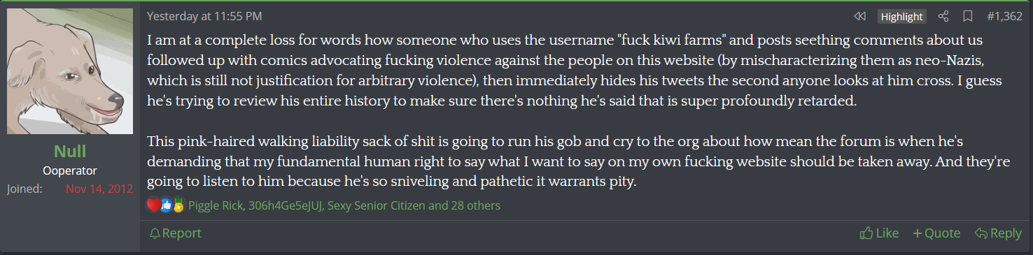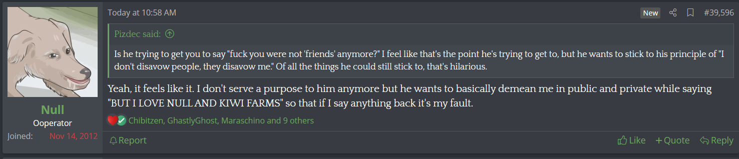 But there's a trend among those that make a name within said community: They always embrace KF when it's beneficial to them but then when they realize they're too much trouble for their worth they attempt to drop them, see poast, but this always upsets some kiwifag: Every time, without fail, gossip will blossom and that eventually means Null can't play nice anymore.