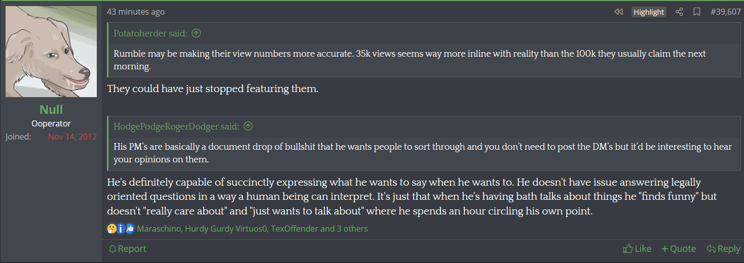 Do you think KiwiFarms can exist without Null? As I've said elsewhere, my understanding (and this is something I didn't know when I joined the forum) is that KiwiFarms is essentially just an appendage of MATI, kinda like the "research and development" department of MATI. I came to understand that KiwiFarms exist as a platform for Null to collect unique lolcow material for MATI. KiwiFarms is useful for Null as long as it provides fodder and filler for his podcast. Null's main interest is MATI, KiwiFarms is just a necessary evil he has to maintain for the sake of MATI.
