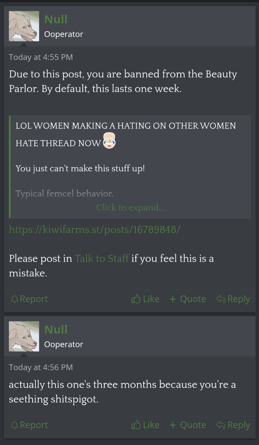 I cannot believe how hypocritically stupid he is being because Kiwi Farms is full of people who document and laugh at trannies yet the trannies think that equals literally killing them by misgendering them and revealing their dead name. Null always complains about how overdramatic that is but he's acting like himself.